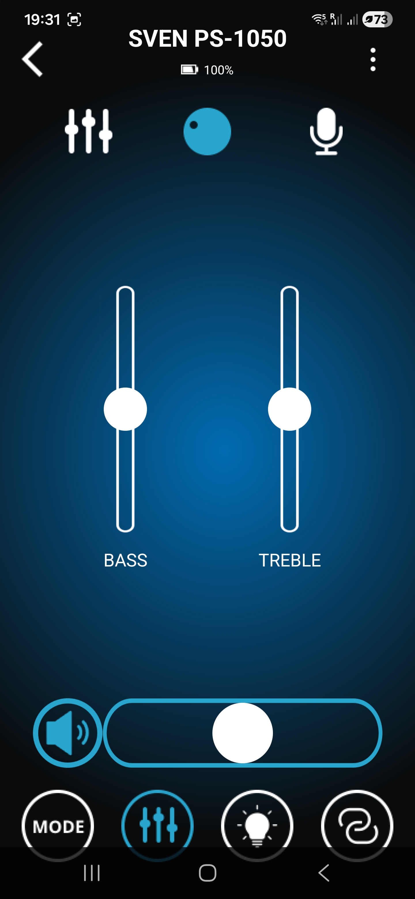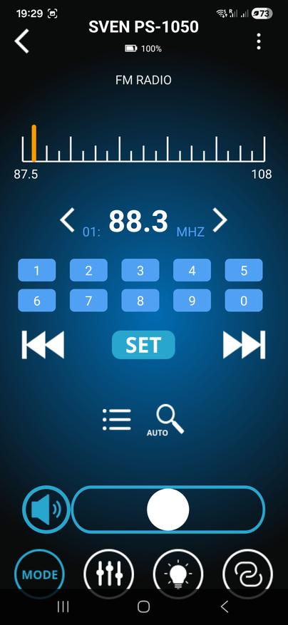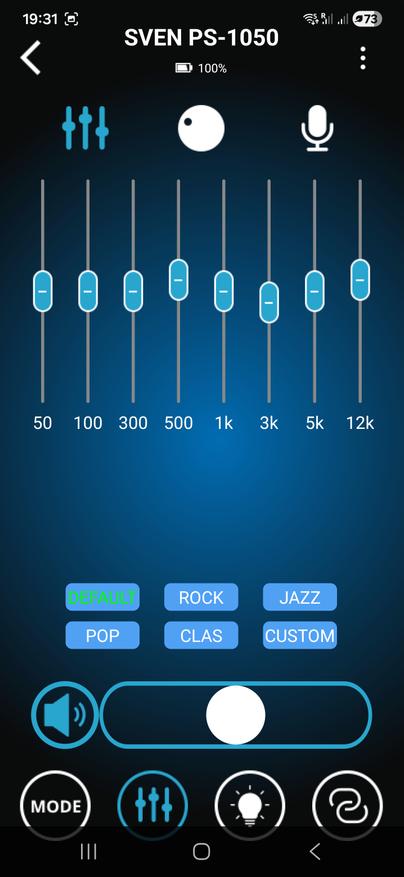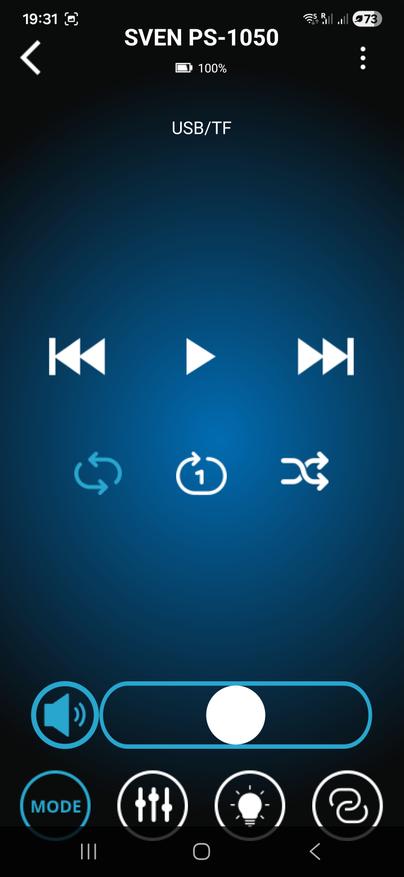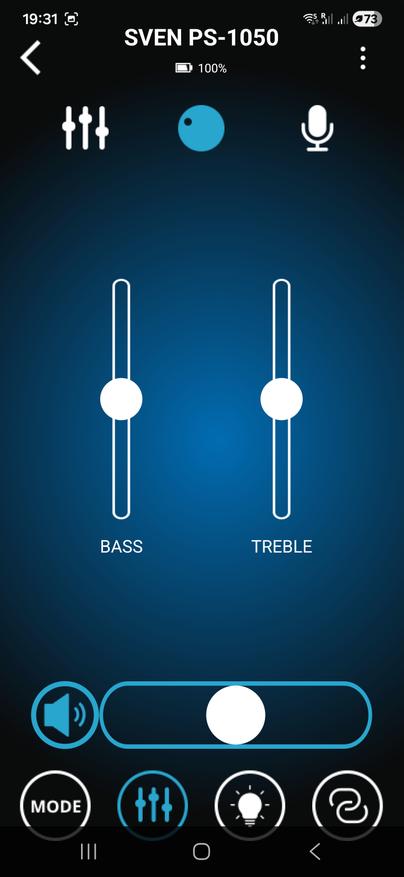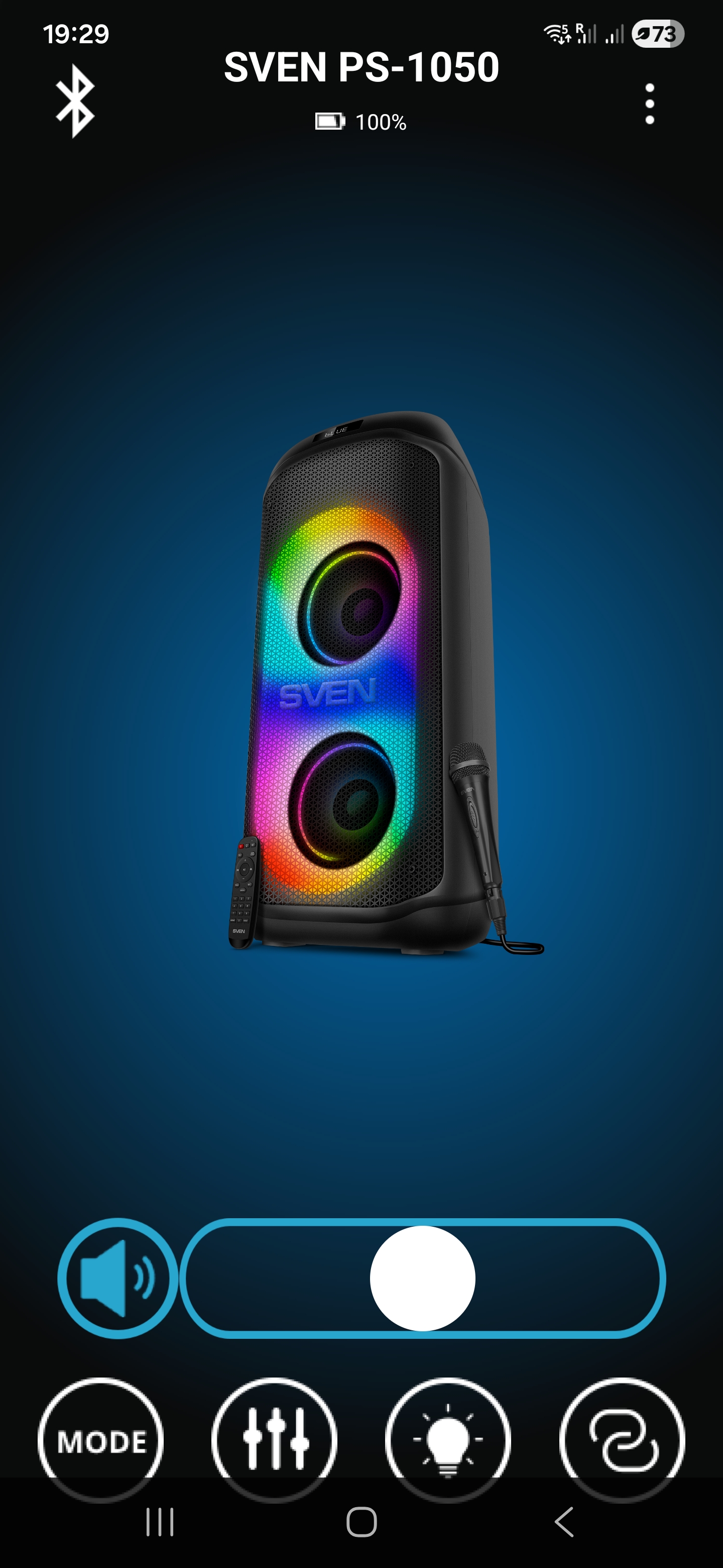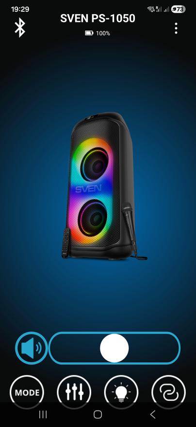 Помимо классического управления кнопками на верхней панели предусмотрена возможность дистанционного управления через комплектный пульт ДУ либо через мобильное приложение Sven Sound. Настройки приложения позволяют осуществлять настройку эквалайзера, предусмотрены встроенные пресеты и режим усиления низких частот. Помимо этого, приложение позволяет управлять режимами работы, воспроизведением, настройками микрофона и подсветки.