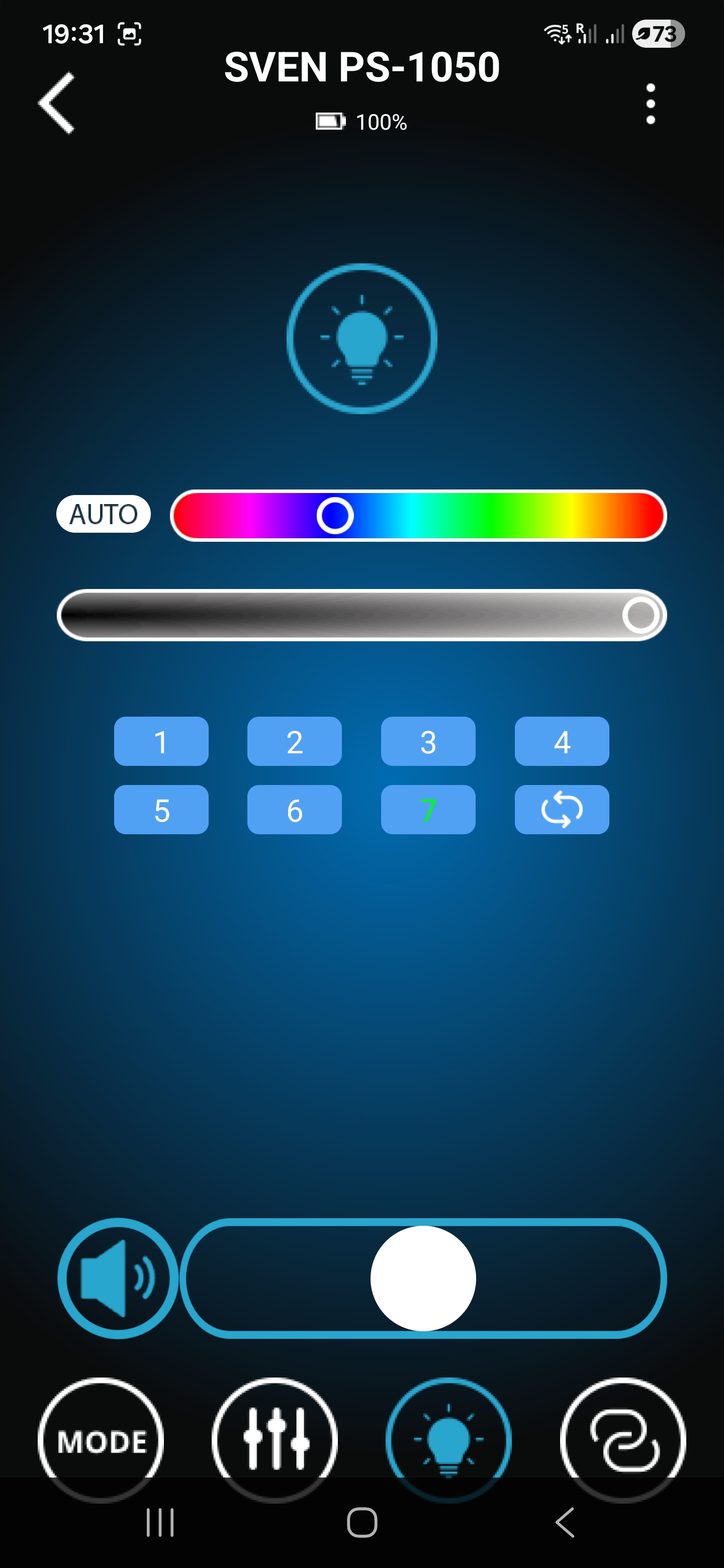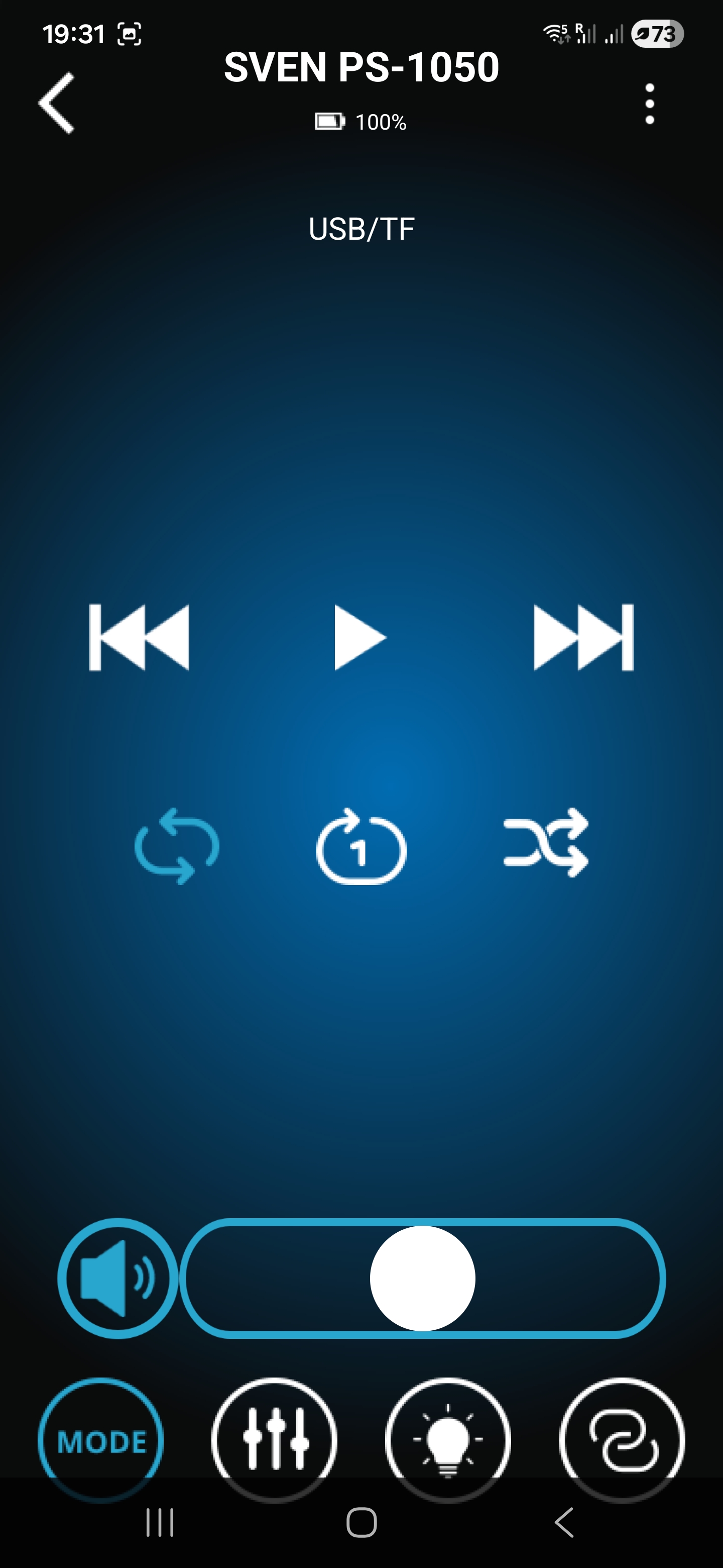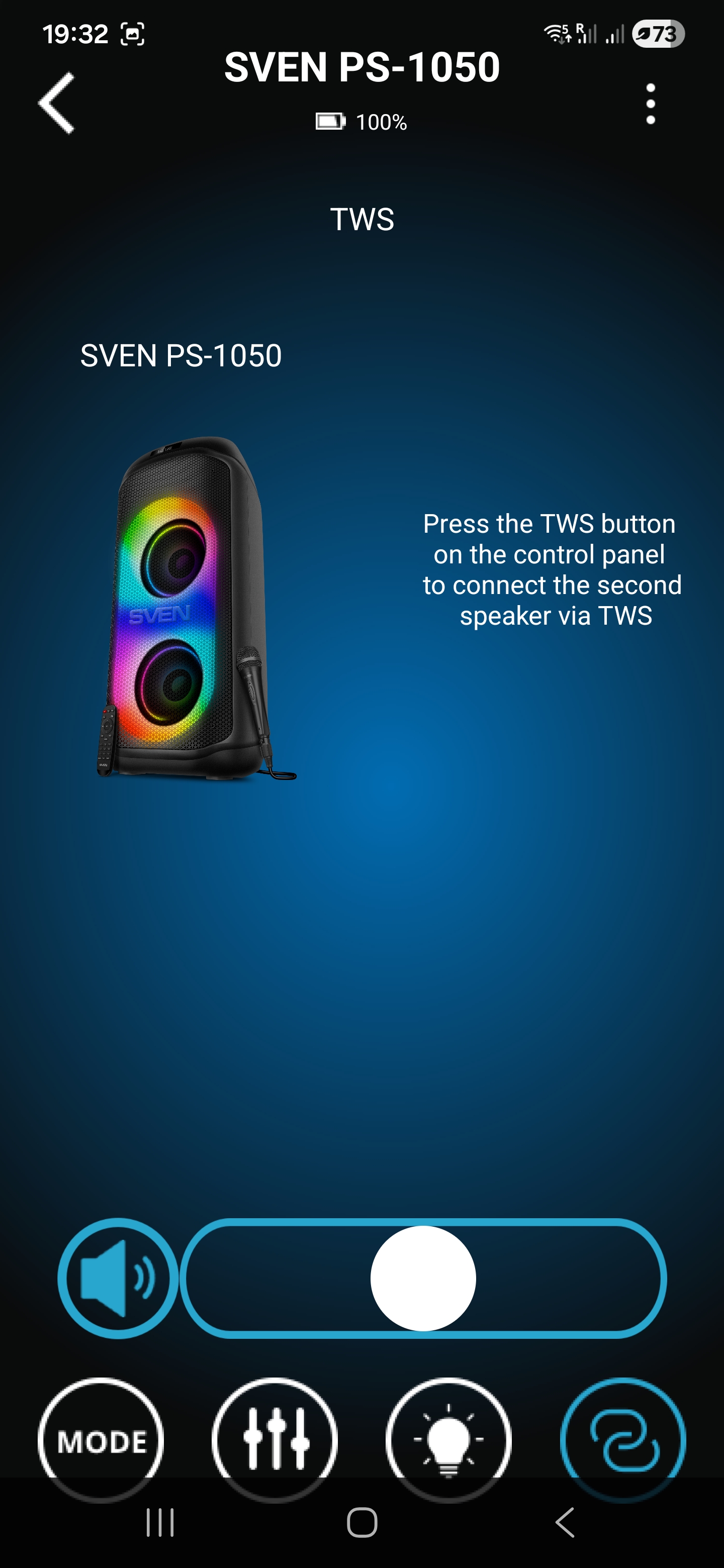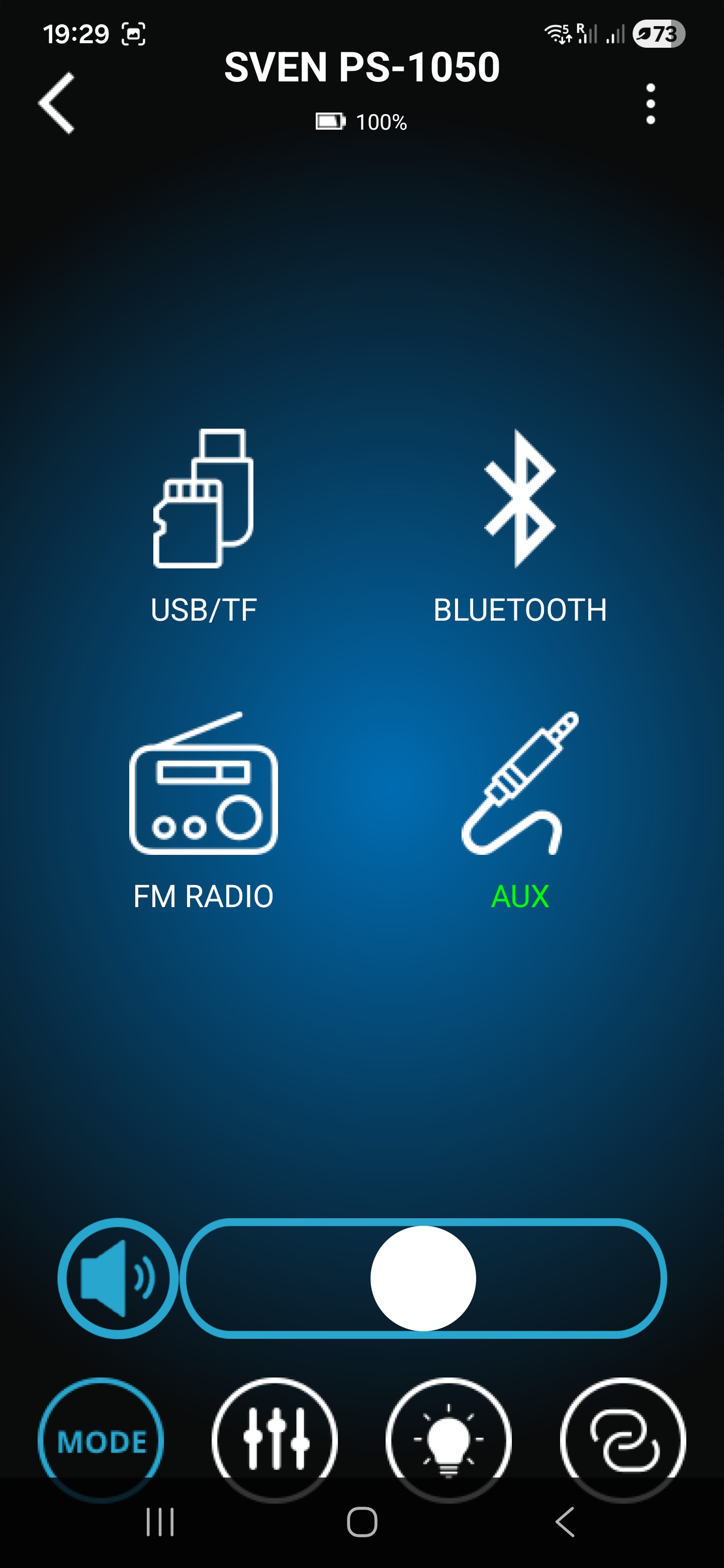 Помимо классического управления кнопками на верхней панели предусмотрена возможность дистанционного управления через комплектный пульт ДУ либо через мобильное приложение Sven Sound. Настройки приложения позволяют осуществлять настройку эквалайзера, предусмотрены встроенные пресеты и режим усиления низких частот. Помимо этого, приложение позволяет управлять режимами работы, воспроизведением, настройками микрофона и подсветки.