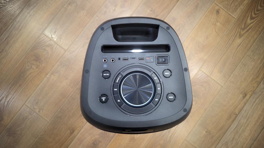 Первое, что бросается в глаза, это верхняя панель управления. Она немного утоплена в корпус, вокруг есть бортик, который защищает кнопки и разъемы от случайных касаний. Здесь же расположена ручка для переноски. Она интегрирована в корпус, без выступающих элементов, рука ложится в нее естественно, зазор достаточный, чтобы поднимать колонку одной рукой. Рядом с ручкой сделан отсек под смартфон. Это неглубокий паз, в который телефон ставится вертикально. Вся коммутация собрана в верхней части панели, под ручкой. Разъемы подписаны прямо на корпусе. Слева направо идут вход для гитары 6.3 мм, микрофонный вход 6.3 мм, линейный вход 3.5 мм, USB-порт для флешки, слот для microSD, отдельный USB-разъем для зарядки внешних устройств с маркировкой 5V-1A и порт USB Type-C для зарядки самой колонки. Рядом расположен светодиод индикации зарядки и механический тумблер питания. Чуть в стороне видно обозначение NFC. Центральную часть верхней панели занимает круглый блок управления. В центре крупный регулятор громкости, вокруг него кольцо кнопок. Кнопки разделены на сектора и подписаны. Здесь находятся управление треками, пауза, повтор, TWS, эквалайзер. Чуть отдельно вынесены кнопки MENU и MODE, они расположены ближе к правому краю панели. Слева находятся кнопки MIC PRI и LIGHT. Такое расположение визуально разделяет функции: звук и воспроизведение в центре, режимы и настройки по краям.