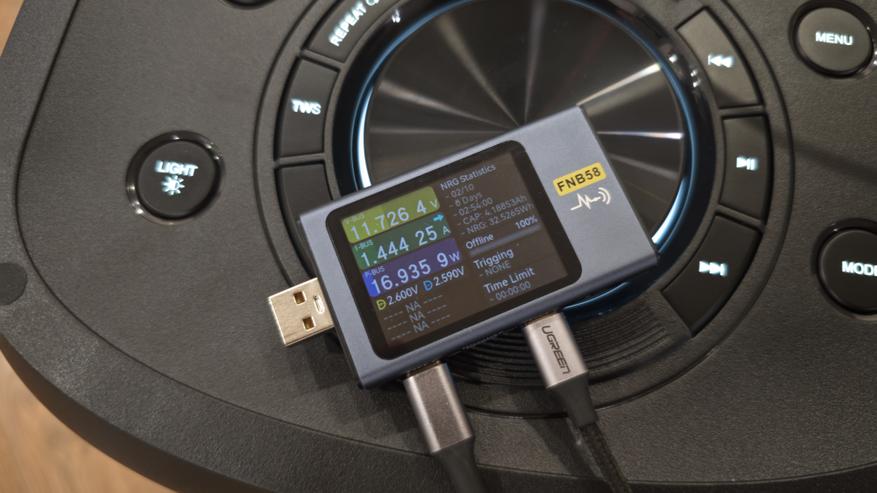 Зарядку колонки я проверил от штатного сетевого адаптера через USB Type-C с использованием USB-тестера. Во время зарядки мощность держалась примерно на уровне 17 Вт и по ходу процесса не менялась. При этом колонка заряжается без всяких «умных» режимов, просто стабильно берет свою мощность.