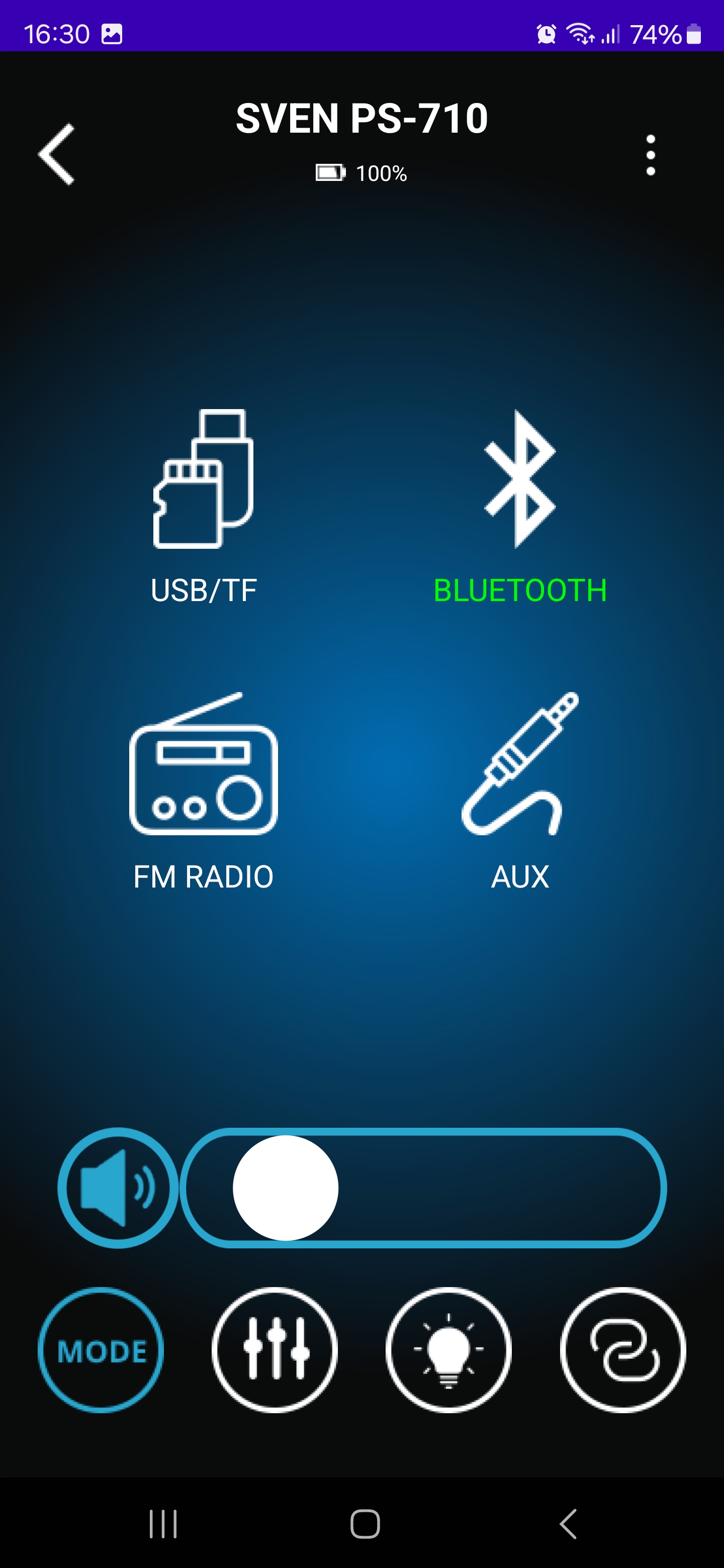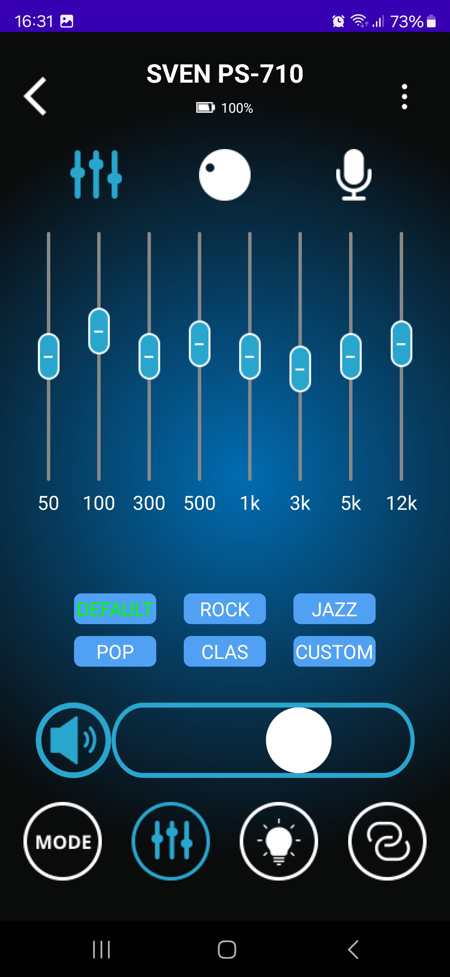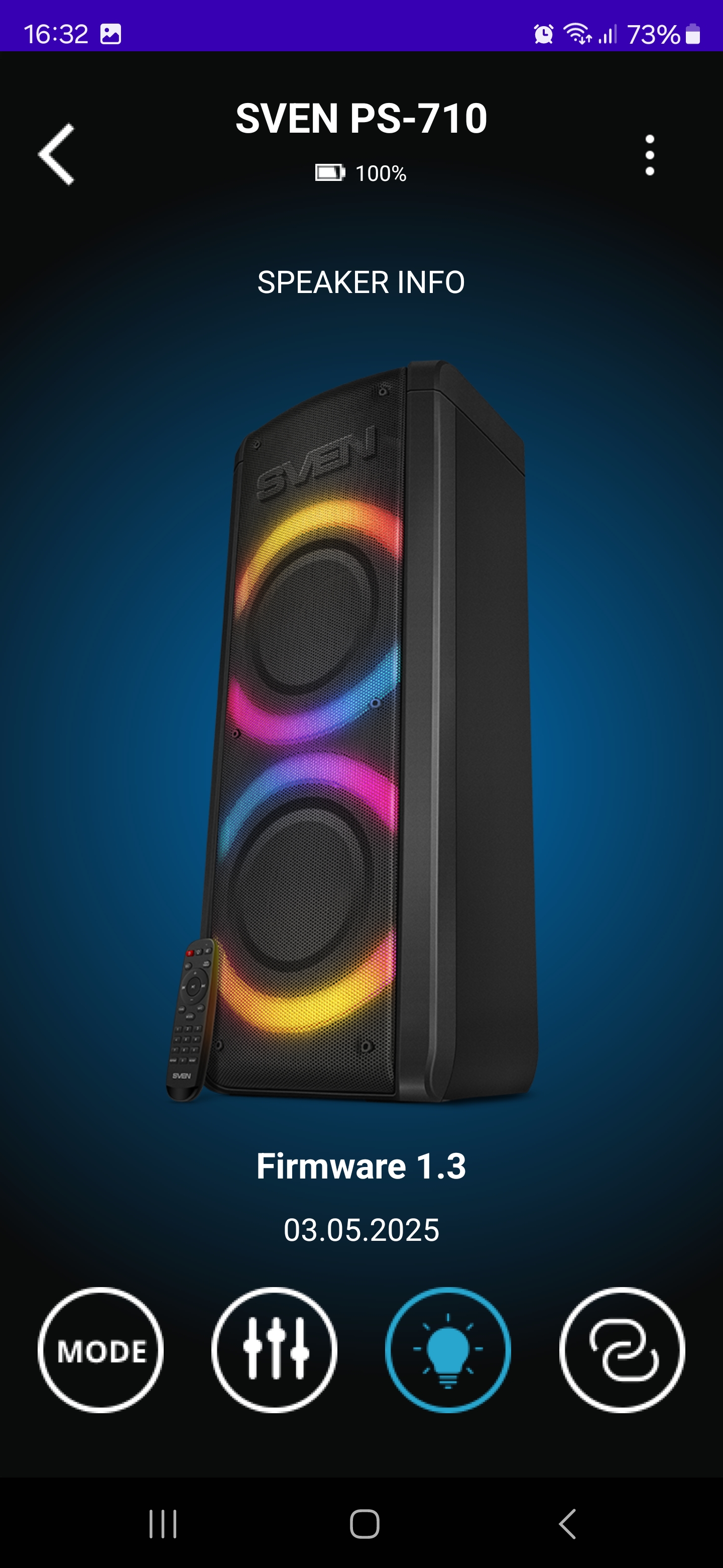 Приложение для управления Sven PS-710 оказалось удобным инструментом, который действительно упрощает работу с колонкой. Оно позволяет не только переключать режимы воспроизведения и управлять звуком, но и тонко настраивать эквалайзер, регулировать параметры микрофонов, изменять подсветку и даже проверять уровень заряда аккумулятора. Все это доступно прямо со смартфона, без необходимости каждый раз подходить к колонке и нажимать кнопки.