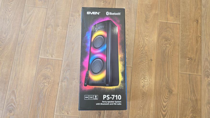 Колонка Sven PS-710 поставляется в достаточно крупной картонной коробке. На коробке указаны основные характеристики устройства. Внутри колонка надежно зафиксирована в пенопластовых вставках, что предотвращает её смещение во время перевозки.