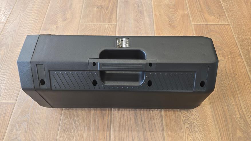 Боковые стороны колонки выполнены из пластика, который устойчив к загрязнениям и следам от пальцев. Задняя часть устройства имеет строгий вид — здесь нет активных элементов, но можно заметить транспортировочную ручку, интегрированную в корпус, которая позволяет легко переносить устройство.