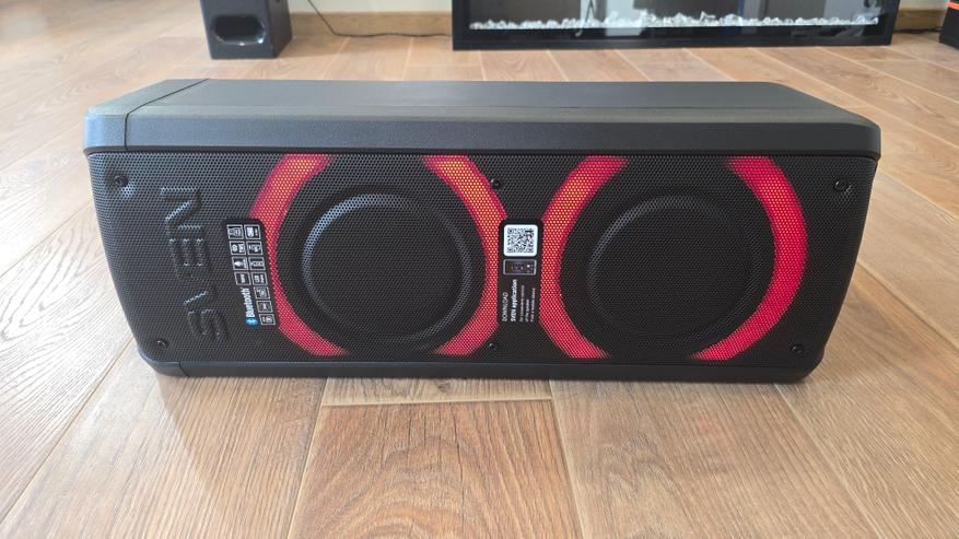 Громкости хватает для различных сценариев, будь то прослушивание музыки дома, на улице или использование в качестве системы для караоке. В помещении звук распространяется равномерно, но для большей насыщенности низких частот колонку нужно расположить ближе к стене. На открытом пространстве бас становится менее выраженным из-за отсутствия отражающих поверхностей.