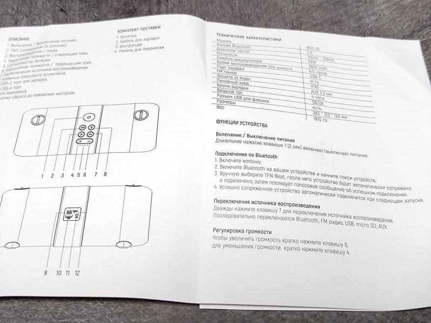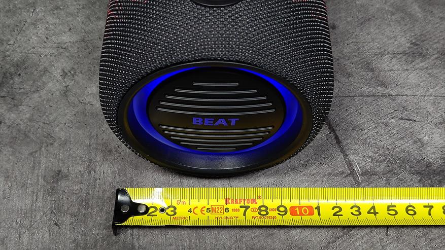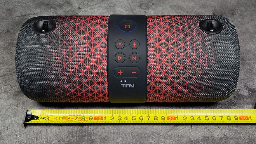 Самая большая кнопка наверху — вкл/выкл., имеет синюю LED-окантовку во включенном состоянии. Далее кнопка 8-ка — для соединения с ещё одним братом-близнецом в TWS-режиме. Клавиша с микрофоном для звонков, затем клавиши для воспроизведения/остановки воспроизведения музыки, изменения громкости и выбора режимов, через которую также выбирается режим FM-радио, — в котором доступны автопоиск станций, переключение между ними и изменение громкости. После выключения и включения, колонка запоминает последнюю установленную радиоволну.