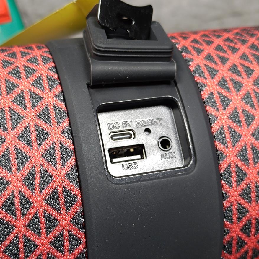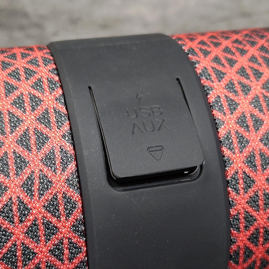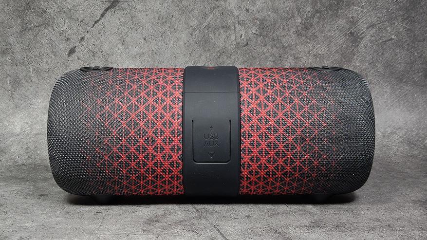Под резиновой заглушкой с обратной стороны скрываются порты и разъёмы — USB-C для зарядки колонки (примерно 4ч), USB-A порт для флешек с музыкой (поддерживаются FAT32) и AUX-вход для проводного подключения источников звука. Слот под microSD-карточки отсутствует, что несомненно минус.