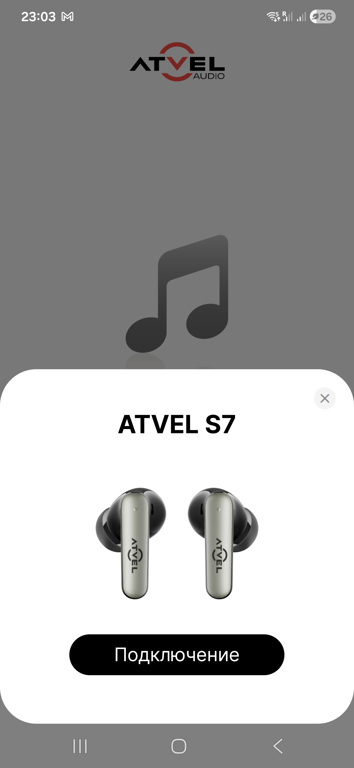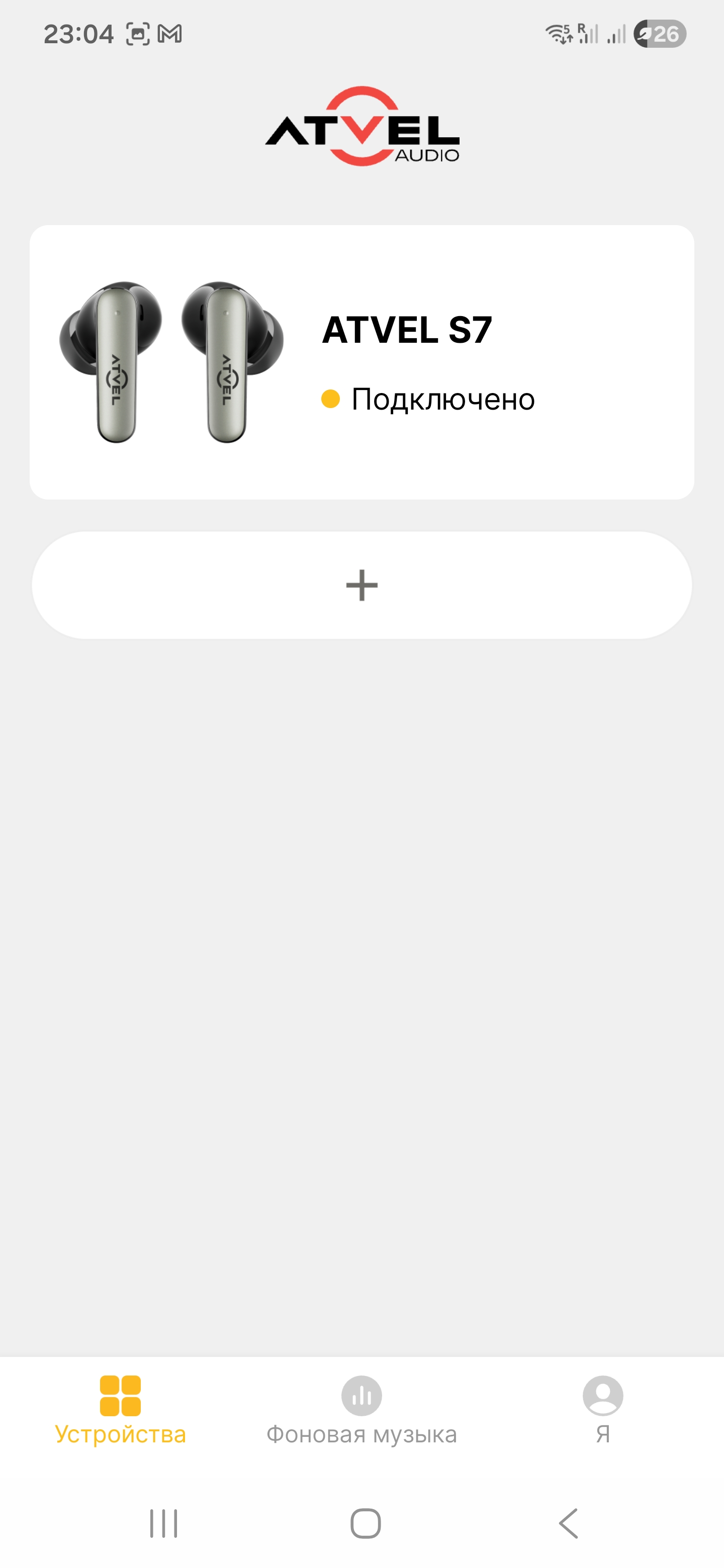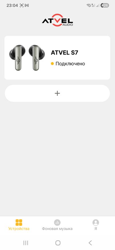 Для работы с S7 Life используется фирменное приложение Atvel Audio. На главном экране отображаются наушники и статус подключения, а также уровень заряда каждого наушника и кейса. Отсюда же открывается карточка устройства с основными настройками.