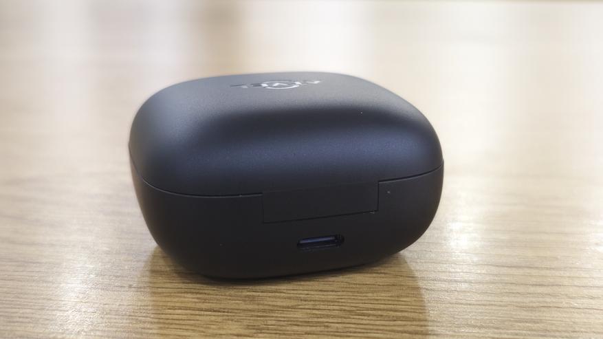 Если переходить к кейсу: крышка плоская, без декоративных элементов, с логотипом Atvel по центру. Корпус квадратный со скругленными углами. На передней части размещен небольшой световой индикатор, чуть выше выемки для открытия крышки. Внутренняя форма повторяет геометрию наушников: углубление под звуковод, широкая ниша под корпус и вытянутая секция под ножку. Контакты зарядки находятся в нижней части посадочного места. Зарядный порт расположен в задней части кейса.