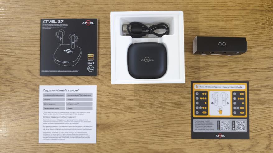 Коробка сделана из белого картона, на лицевой стороне напечатано крупное изображение наушников с зарядным кейсом. В верхней части размещен логотип Atvel, рядом указаны поддержка LDAC и Hi-Res Audio Wireless, а ниже — отметка о Bluetooth 6.0. Оформление простое: светлый фон, акценты только на устройстве и технических обозначениях. Внутреннее пространство организовано таким образом, что все элементы комплекта поставки надежно зафиксированы и не болтаются при транспортировке.