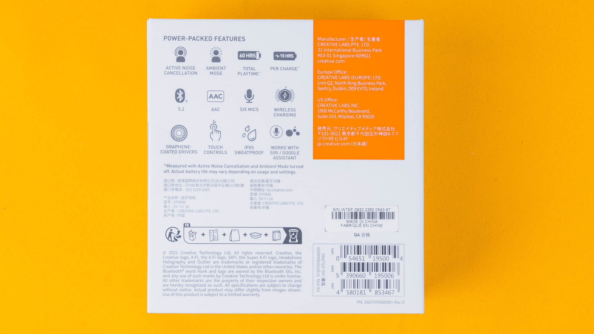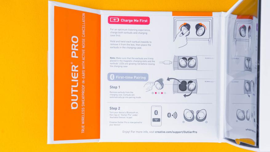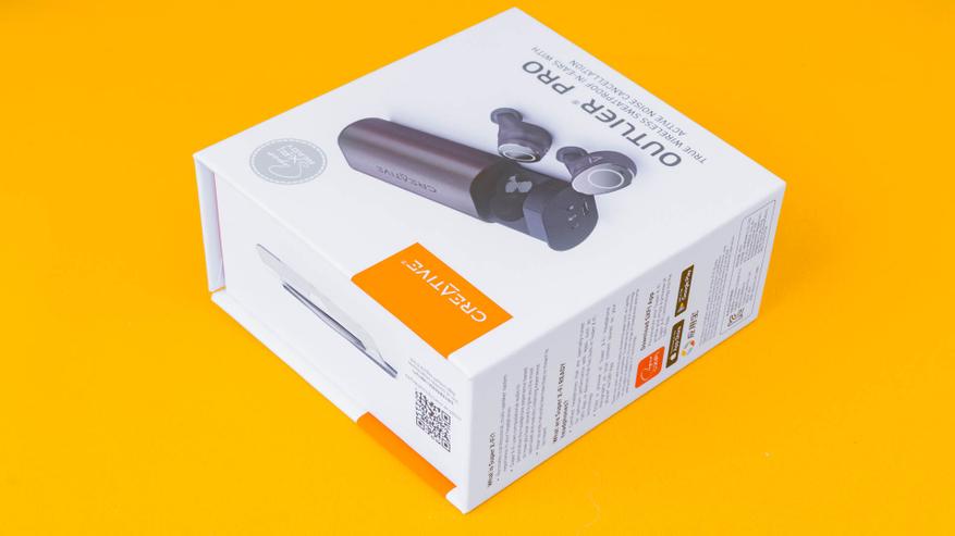 Беспроводные наушники Outlier Pro поставляются в белой плотной картонной коробке, крышка которой открывается как обложка у книги. На лицевой стороне крышки красуется изображение зарядного чехла наушников, сами наушники Outlier Pro, а так же указана поддержка технологии Super X-FI. Кратко о данной технологии и приложении указано на одной из боковых граней упаковки. На противоположной грани схематично указана комплектация. Тыльная сторона упаковки перечисляет ключевые особенности данной модели.