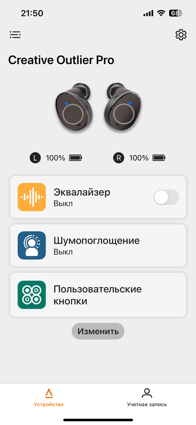 Для полноценного взаимодействия и раскрытия большинства возможностей беспроводных наушников Creative Outlier Pro, потребуется скачать на свой смартфон приложение Creative App. Данное приложение выпускается как на смартфоны под операционной системой IOS, так и под Android. Меню приложения русифицировано и структурировано для удобного использования. В приложении Creative App отображается уровень заряда аккумуляторов в наушниках, так же можно выбрать один из пресетов эквалайзера, настроить шумоподавление/прозрачность, а в пользовательской вкладке настроить сенсорное управление под свои нужды.