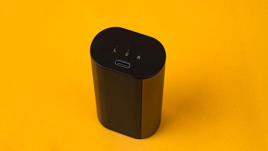 На противоположной грани расположена световая индикация заряда наушников и самого кейса, а так же порт USB Type-C для подключения зарядного кабеля.