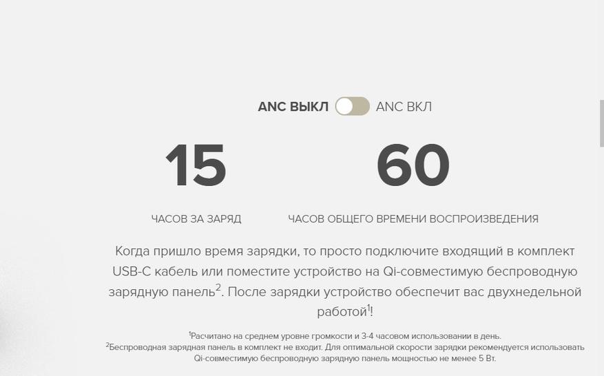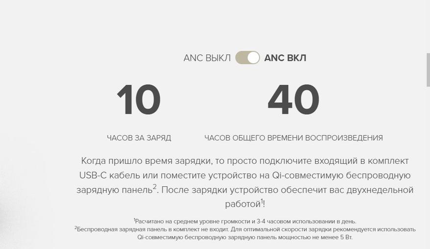 Производитель заявляет 15 часов воспроизведения музыки от одного полного заряда наушников и 60 часов работы с учетом заряда наушников от кейса без включенной функции шумоподавления. С включенной функцией шумоподавления время работы сокращается на треть и составляет 10 и 40 часов соответственно. В реальной жизни полностью заряженных наушников с кейсом хватает приблизительно на две недели прослушивания музыки, подкастов, аудио-книг и т.д. в умеренном использовании.