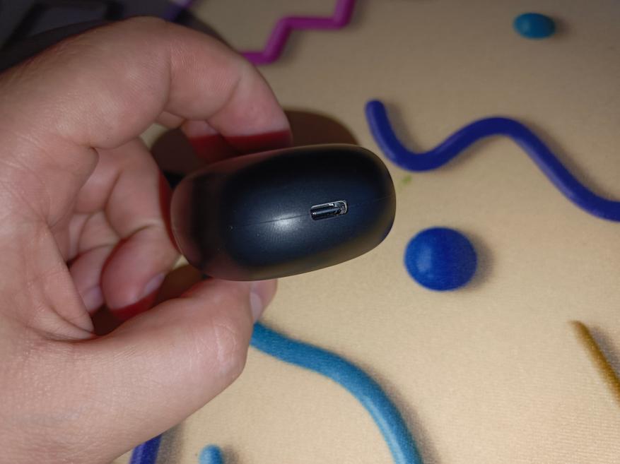 Кейс наушников овальной формы, компактный, пластиковый. И наушники, и кейс черного цвета. Снизу расположился порт USB-C. Поверхность выполнена из матового пластика. На передней части кейса есть световой индикатор, меняющий цвет в зависимости от заряда кейса и состояния зарядки наушников. Размер кейса 62х54х30 мм.