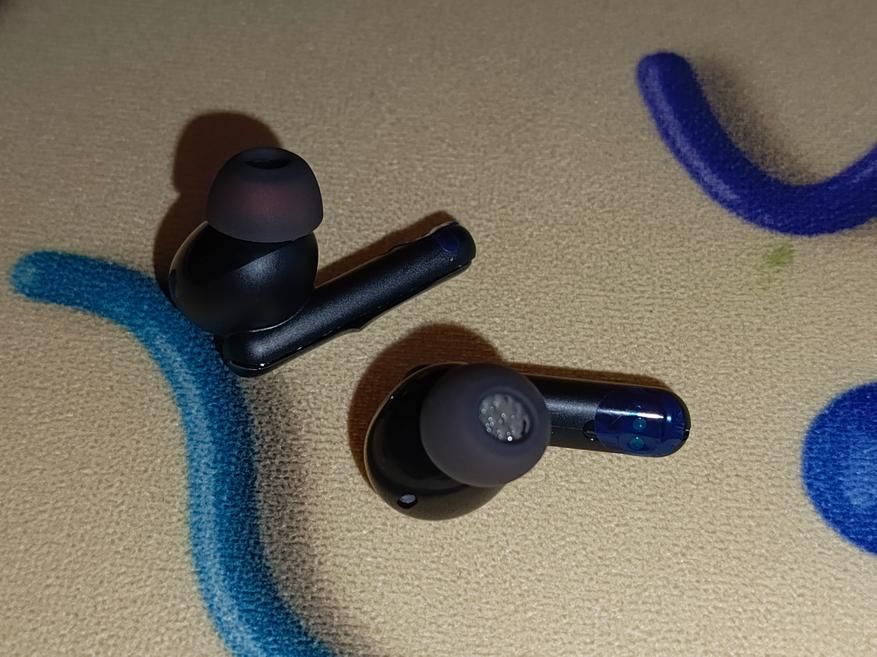 В данных наушниках заявлена титановая диафрагма, что должно улучшить качество звука и оправдать добавку «Pro» к названию, а также функция «гибридного шумоподавления». «Гибридное» — означает, что активное шумоподавление здесь реализовано с помощью двух микрофонов в каждом наушнике, направленных в разные стороны. Это позволяет более точно подбирать противофазу для шумоподавления, чем при использовании только одного микрофона. Сила шумодава — 40дБ, что является хорошим, но не идеальным показателем: у лидера рынка Airpods Pro 60 дБ, а у ноунейм китайцев — 20-30 дБ. Третий же микрофон нужен для разговоров, и располагается на кончике «ножки». Итого — в каждом наушнике по 3 микрофона, а всего их 6.