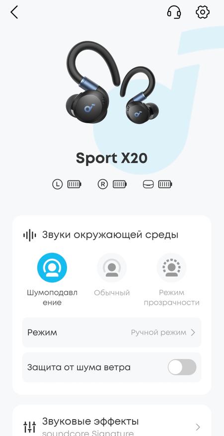 Выбирается режим работы: обычный/шумоподавление/режим прозрачности (чтобы слышать окружающие звуки, не снимая наушники). Отдельно включается защита от шума ветра.