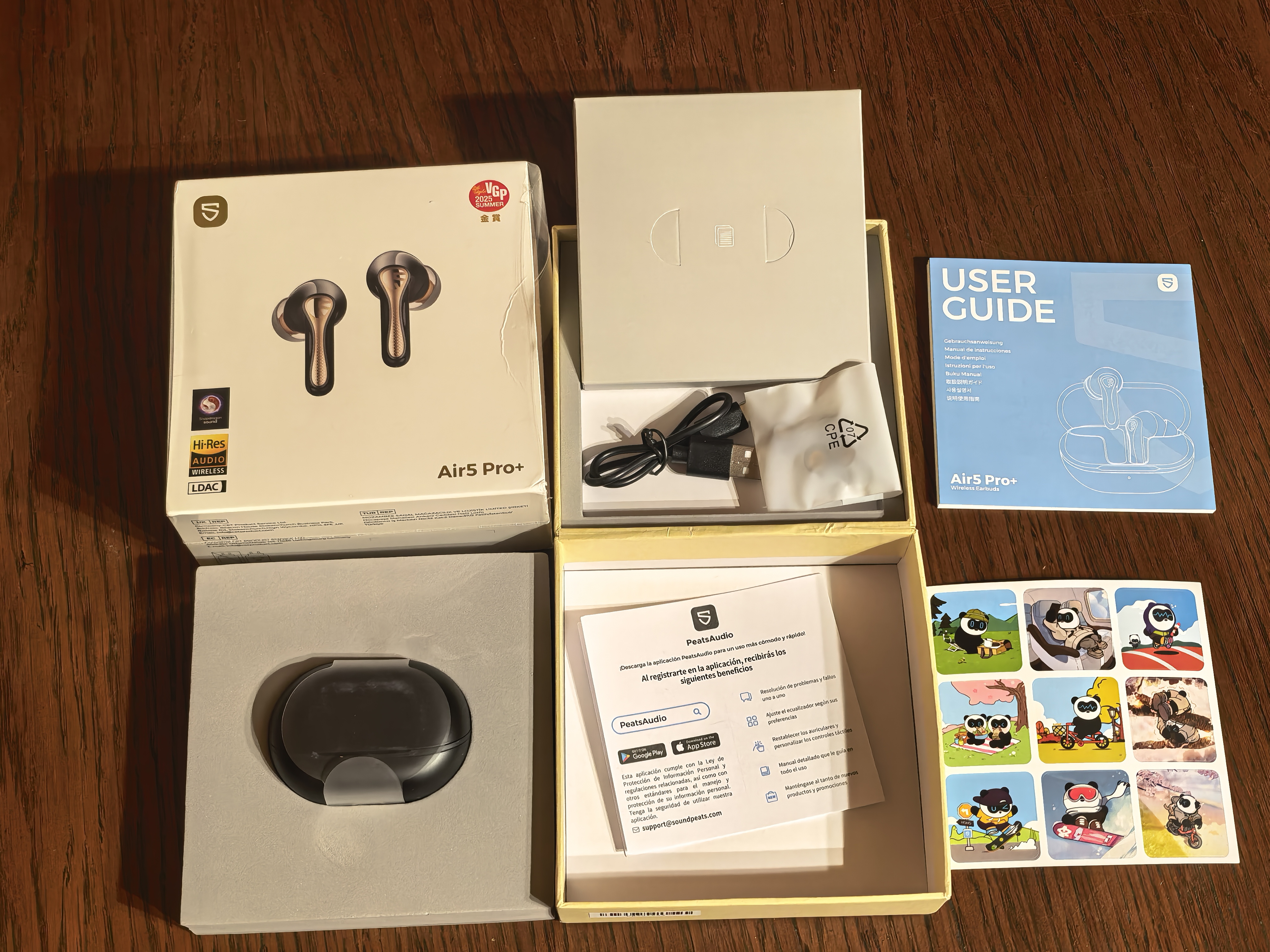 Внутри красивой коробки белого цвета кроме наушников, амбушюр к ним и кабеля с инструкцией есть наклейки. У товара прямая посадка с ножкой. Звуковод не особо длинный, поэтому амбушюру Я выбрал большую, чтобы лучше держалась. Относительно общего впечатления о звуке SoundPEATS Air5 Pro+ действует правило, размер не имеет главное. Важно, им уметь пользоваться. Мне модель понравилась xMEMS, несмотря на то что она стоит дешевле предыдущих моих фаворитов от бренда — наушников H3. Разница между ними есть, о чем рассказано в соответствующем разделе про звук.