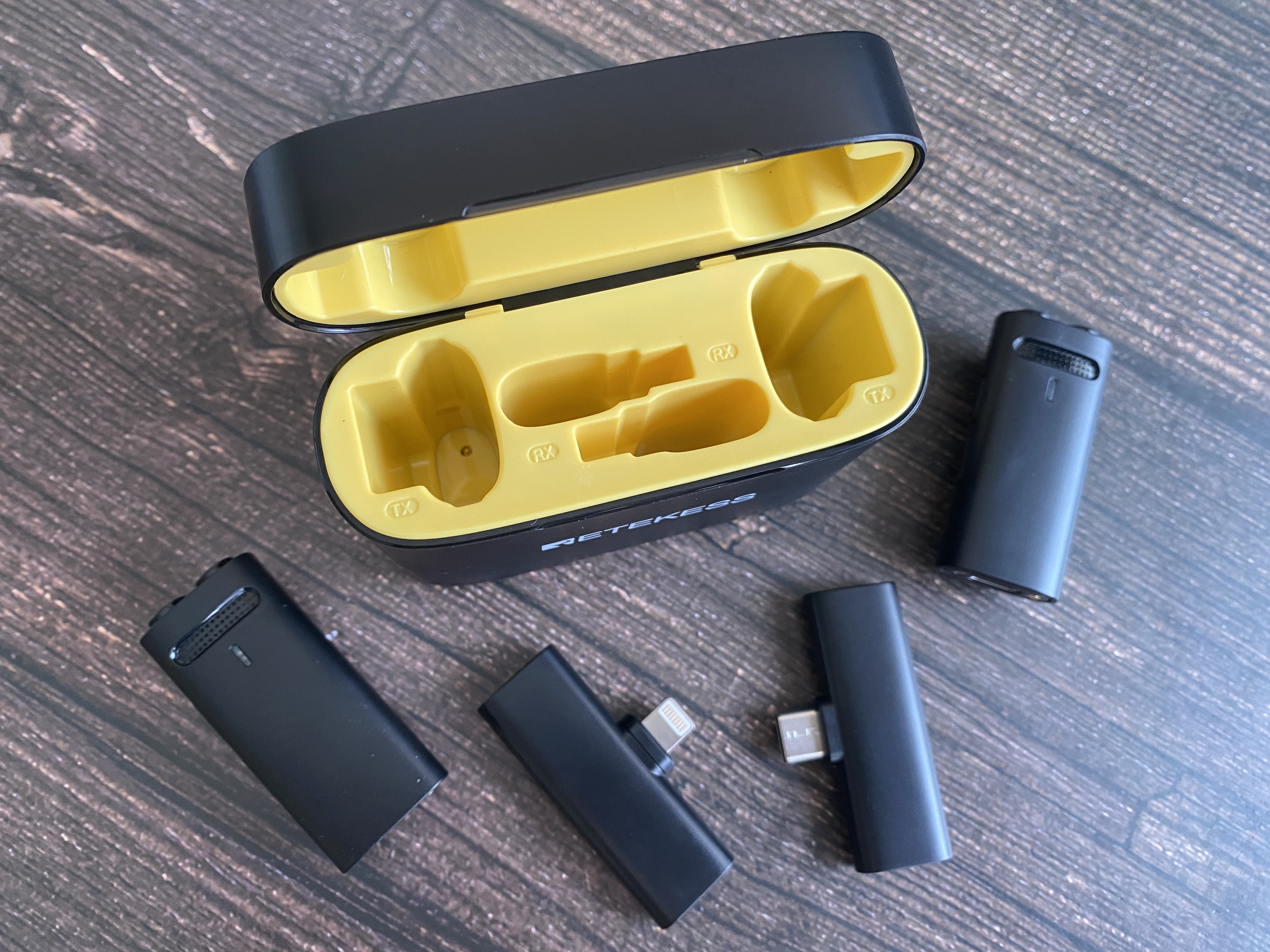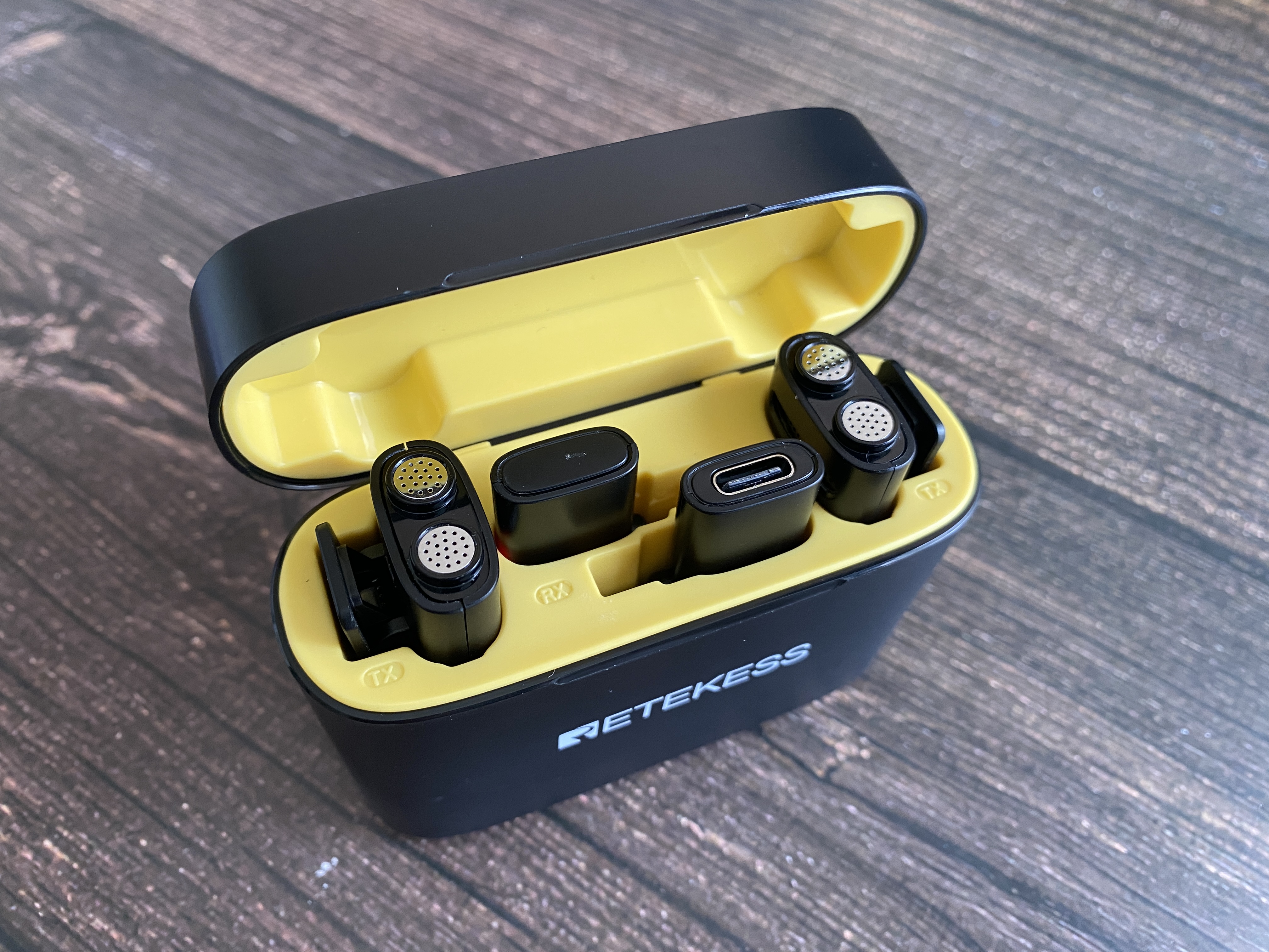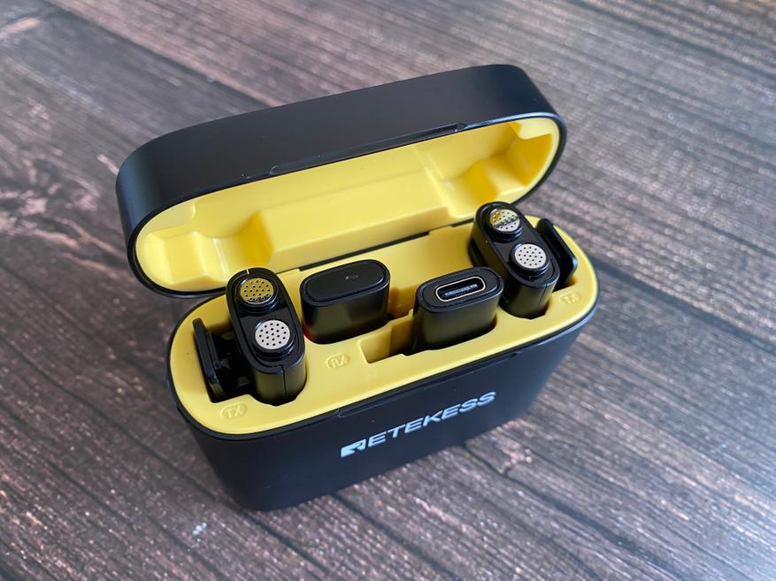 Открыв кейс можем увидеть насыщенный желтый цвет внутреннего пространства. Внутри имеется четыре ниши для хранения и зарядки. Внутри кейса находятся 2 передатчика и 2 приемника. Для зарядки микрофонов используется контактная группа на нижней части.