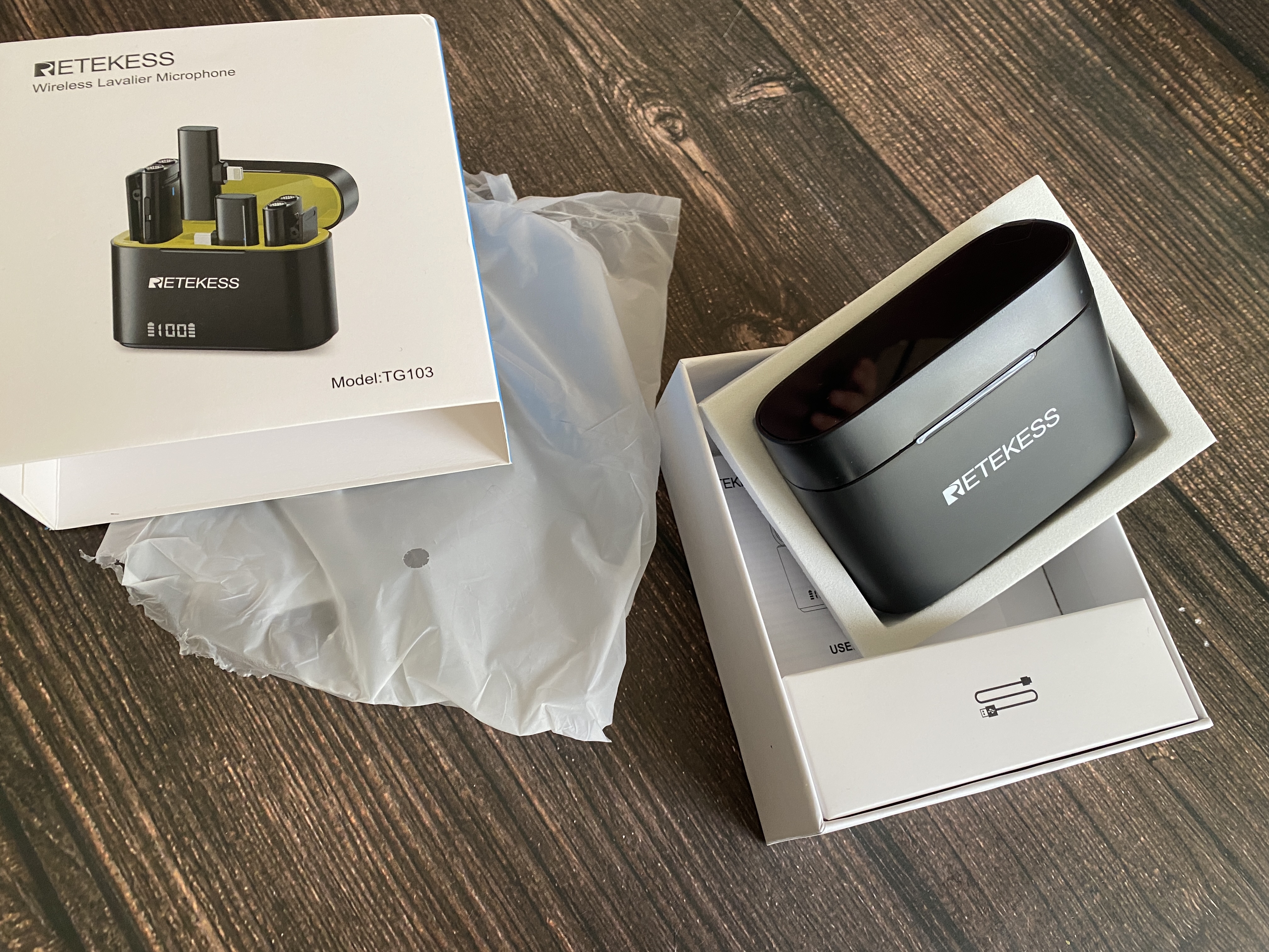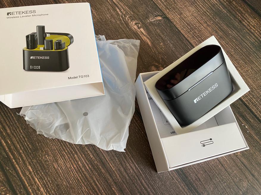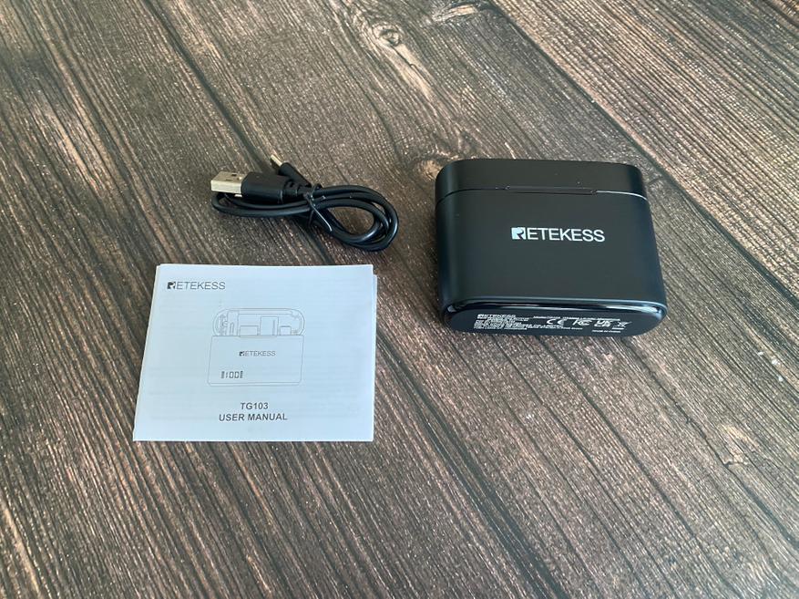 Беспроводные петлички Retekess TG103 поставляются в маленькой картонной коробке. На лицевой части коробки сразу бросается в глаза цветное изображение кейса с петличками, а также на коробке имеются технические характеристики, название модели и логотип компании. Открыв коробку, можем увидеть, что зарядный кейс уложен в мягкий материал, а вся комплектация дополнительно уложена в миниатюрную картонную коробку. В комплектацию входит: Зарядный кейс, 2 передатчика, 2 приемника, кабель USB для зарядки, инструкция по эксплуатации.