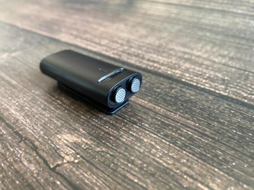 Для удобного крепления микрофона (передатчика) используется пластиковая клипса, которая прекрасно удерживается в нужном месте за счет пластиковых зубцов на конце клипсы. На лицевой части корпуса во время работы загораются светодиодные индикаторы, по которым можно ориентироваться о состоянии микрофонов. За бесперебойную работу микрофонов отвечает встроенный аккумулятор на 140 мАч. Время работы с зарядным кейсом до 7 часов. Комплектный кабель USB имеет разветвление, чтобы пользователь мог сразу осуществлять зарядку обоих микрофонов.
