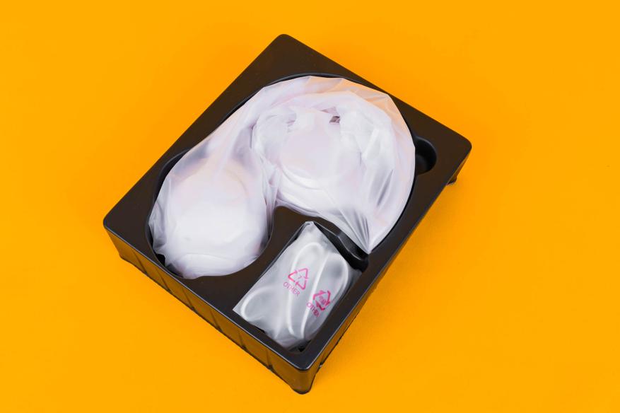 Внутри коробки на ложементе из картона в целлофановых пакетах зафиксированы наушники и комплект поставки к ним.
