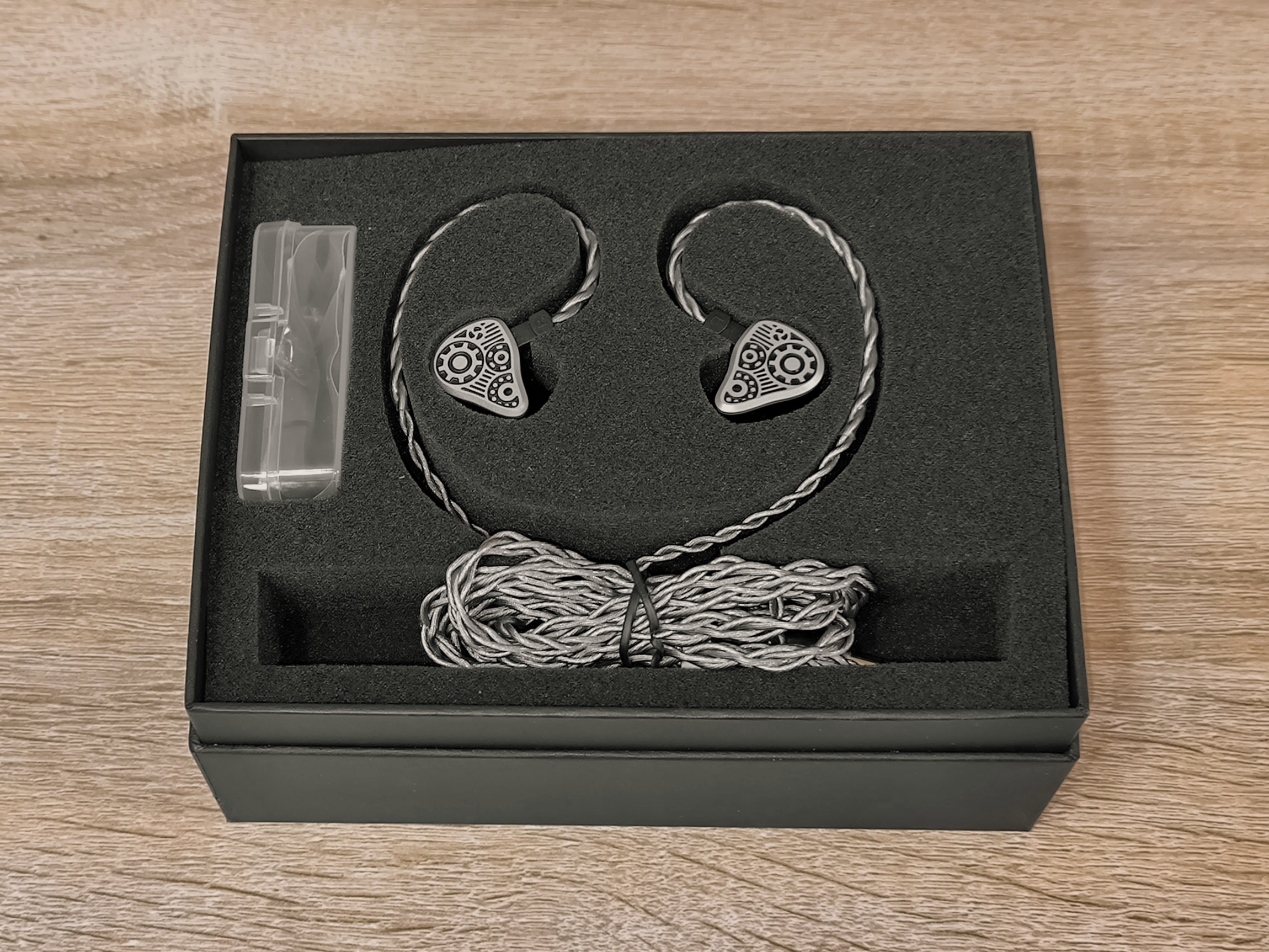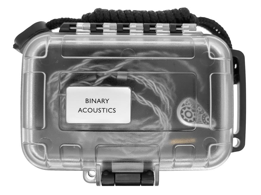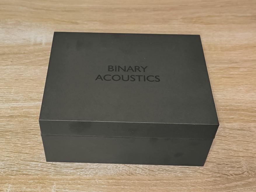 Наушники поставляются в среднеразмерной черной матовой коробке с черной глянцевой надписью Binary Acoustics. На коробку надета суперобложка с контурным изображением шестерен на лицевой стороне, и со спецификациями, контактными данными производителя и графиком АЧХ с обратной стороны.