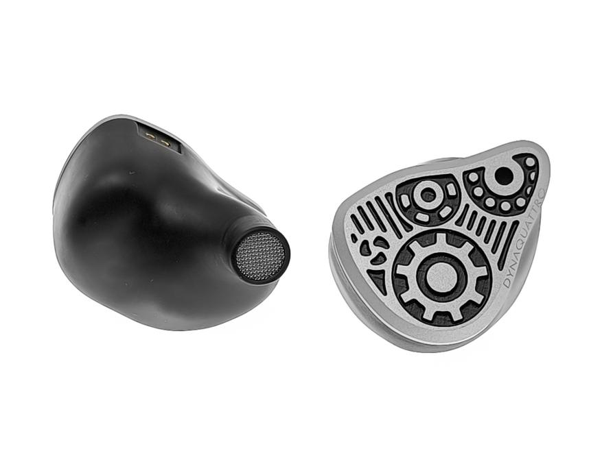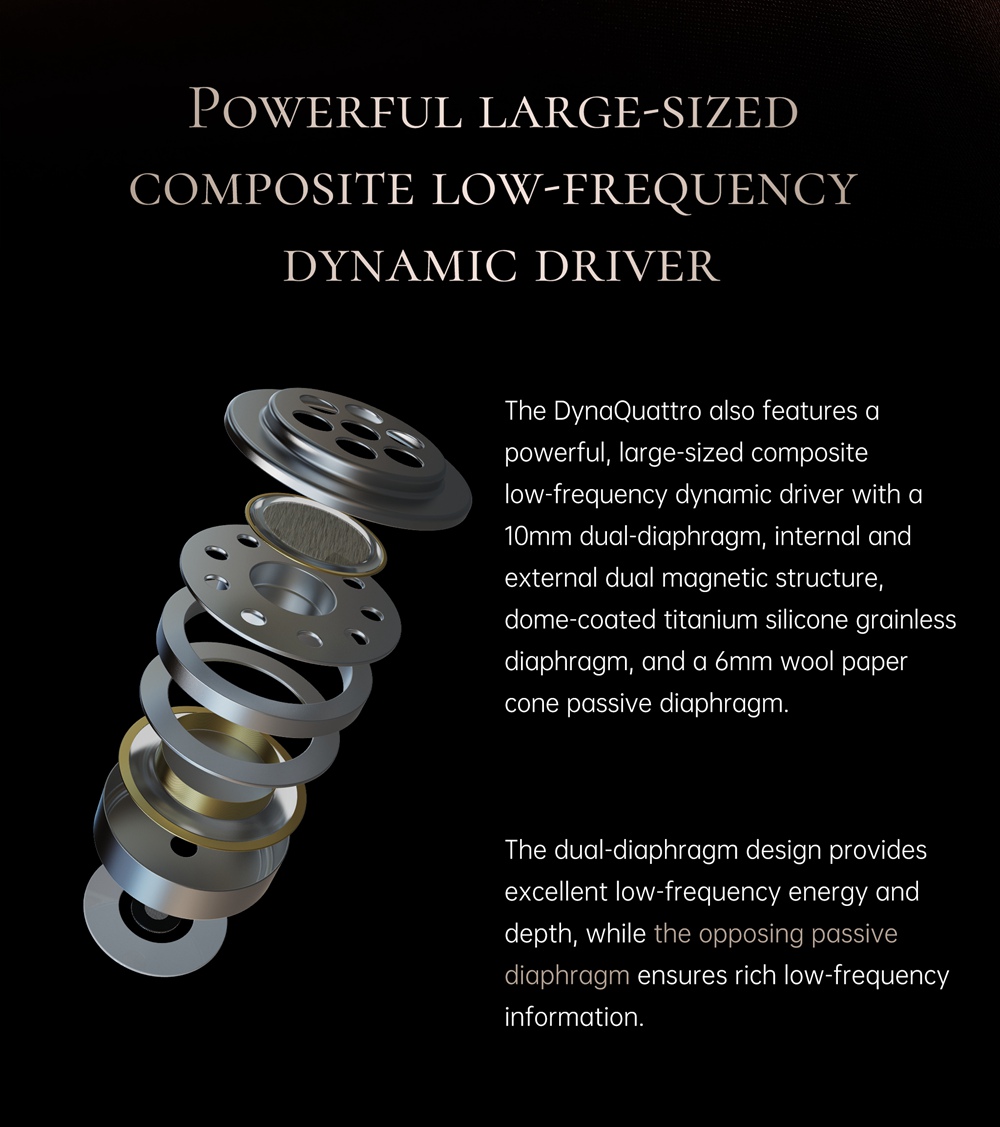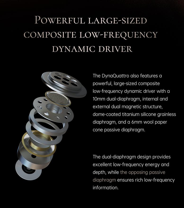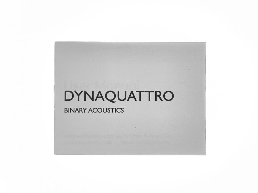 Binary Acoustics Dinaquattro являются четырехдрайверными динамическими наушниками с тремя активными излучателями и одним пассивным, а так же в их оснащении имеется трехполосный кроссовер. За звучание нижних частот отвечает 10 mm активный драйвер с титан-силиконовой диафрагмой и 6 mm пассивный излучатель с бумажной диафрагмой. За звучание средних частот отвечает 8 mm метал-керамический драйвер, а за высокие частоты достались 6.8 mm драйверу с жёсткой алюминиевой диафрагмой.
