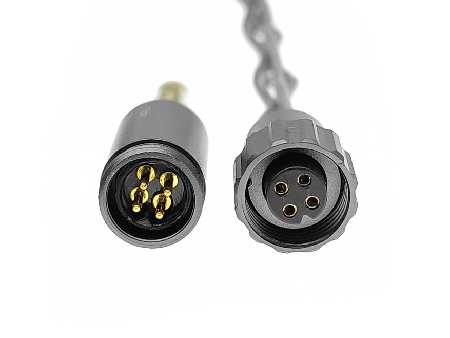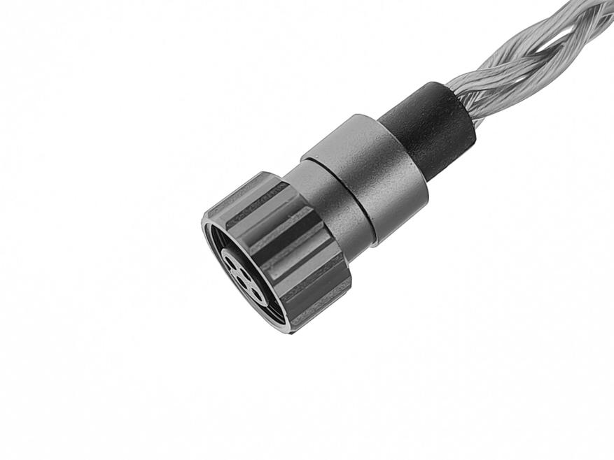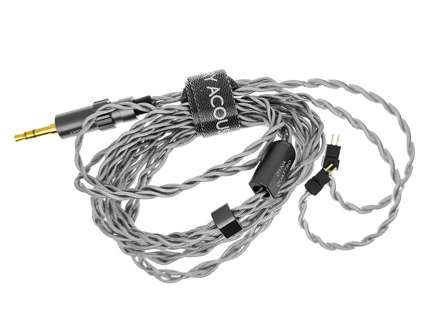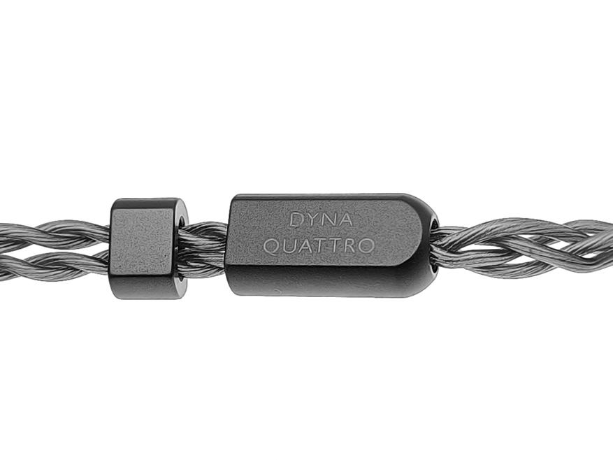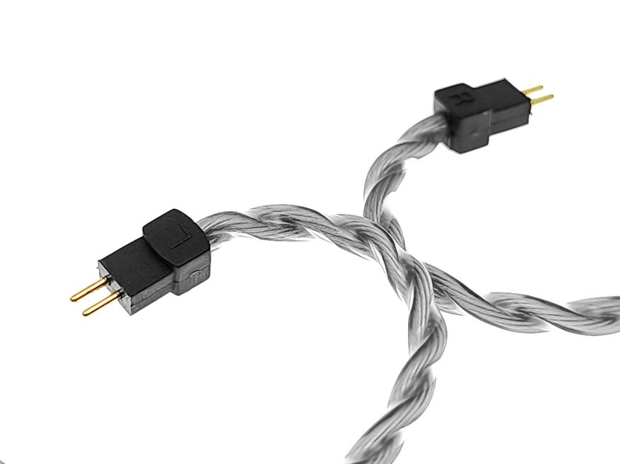 Кабель медный посеребренный, витой четырёхжильный, довольно толстый, жестковатый, слегка упругий и с незначительным эффектом памяти. Фурнитура металлическая. Слайдер, стягивающий два верхних провода, двигается со средним усилием. Для подключения к наушникам используются стандартные двухпиновые коннекторы 0.78 mm, с буквенной маркировкой каналов.