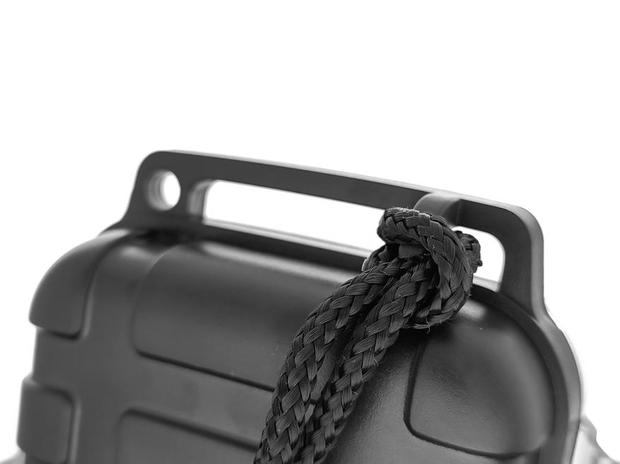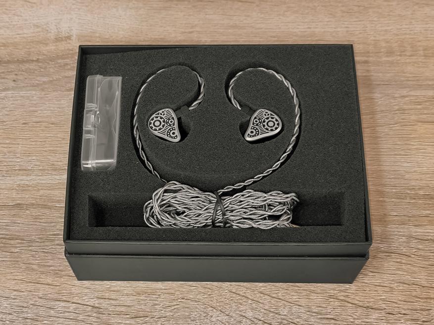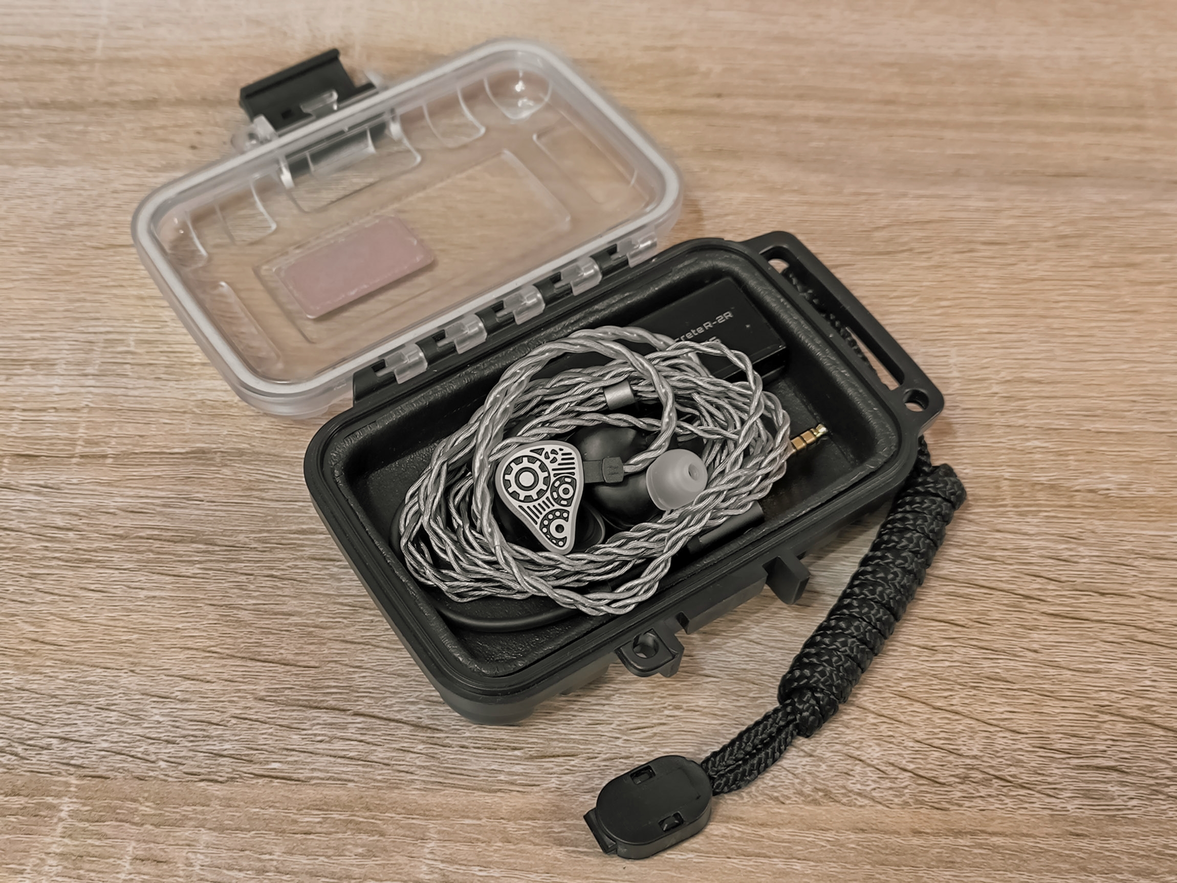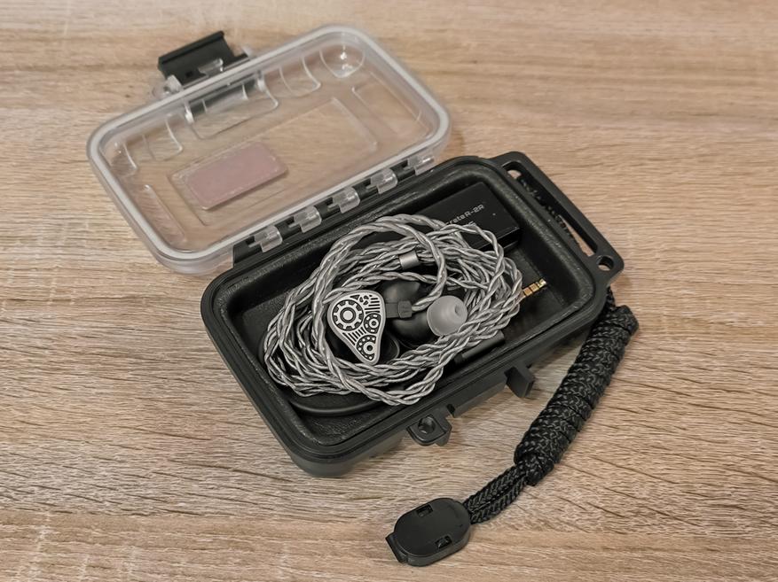 - Большой пластиковый бокс для хранения наушников. Нижняя часть бокса изготовлена из матового черного пластика, а верхняя из матового полупрозрачного. На левом торце бокса имеется три разных отверстия для крепления петли, карабина или чего-то подобного. На одном из этих отверстий закреплён шнур из паракорда. Для фиксации бокса в закрытом состоянии используется большая и тугая защелка, слева от которой находится пара отверстий (по одному в верхней и нижней части бокса), видимо для крепления какого-то замка. Вместе с наушниками, внутрь бокса помещается большой портативный ЦАП Cayin RU6 с подключенным кабелем.
