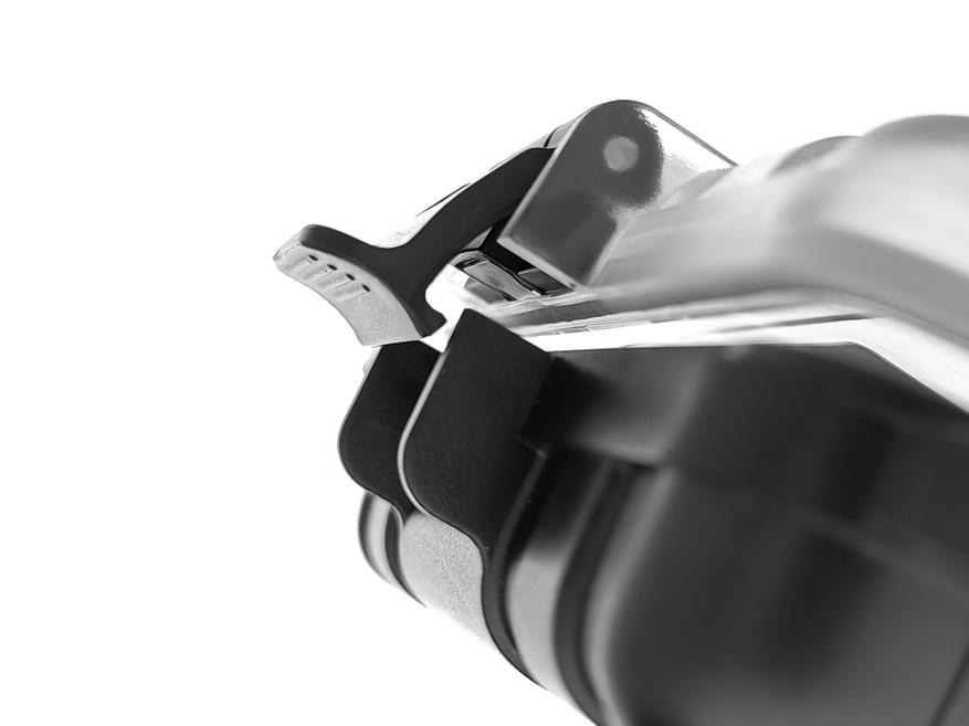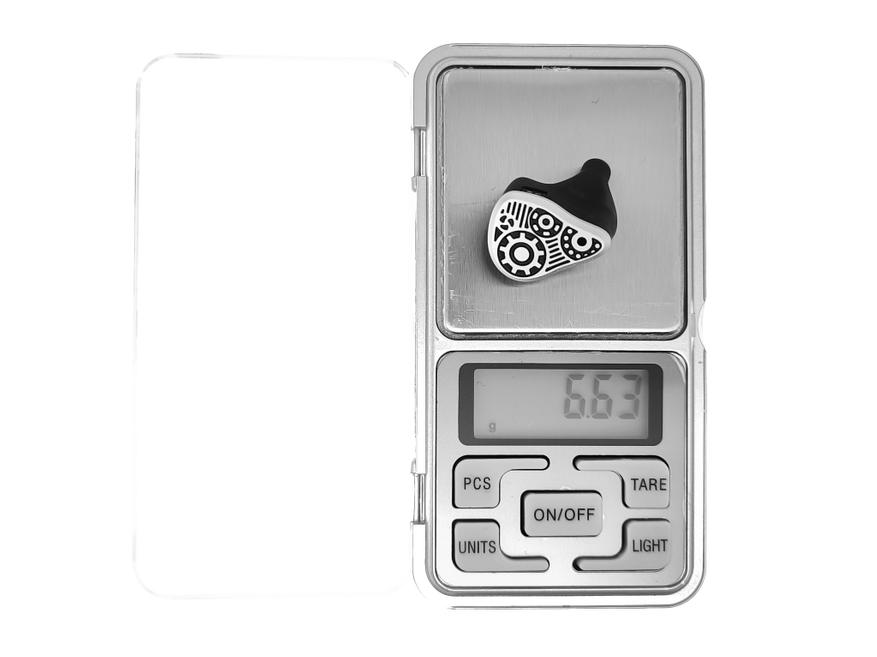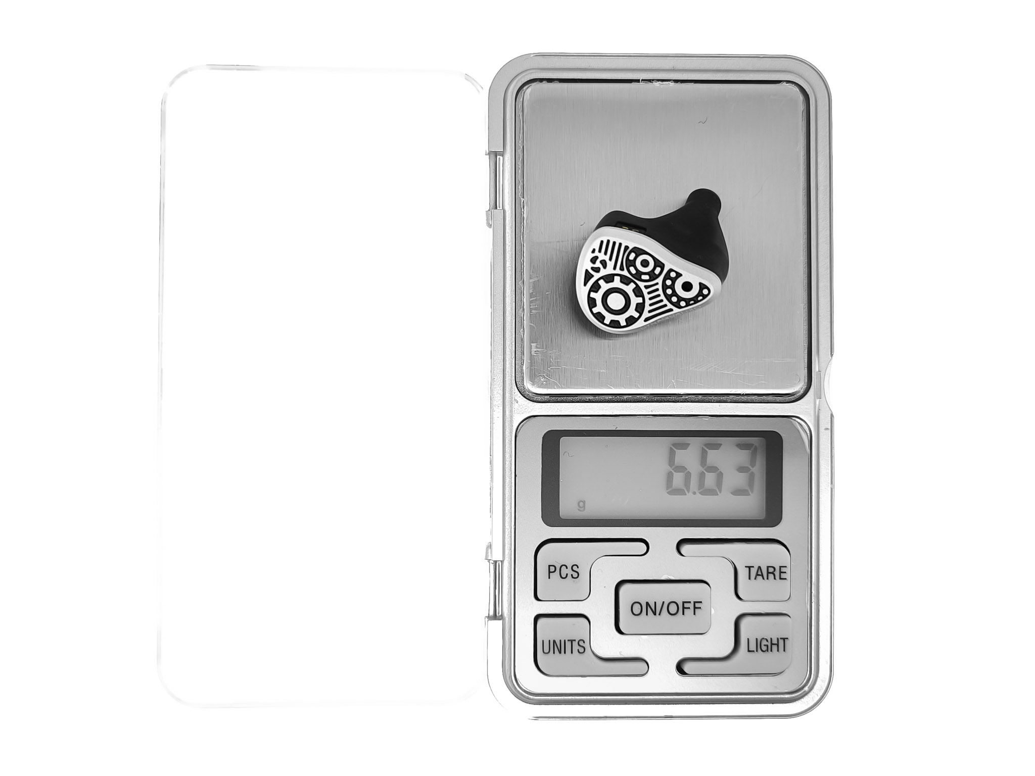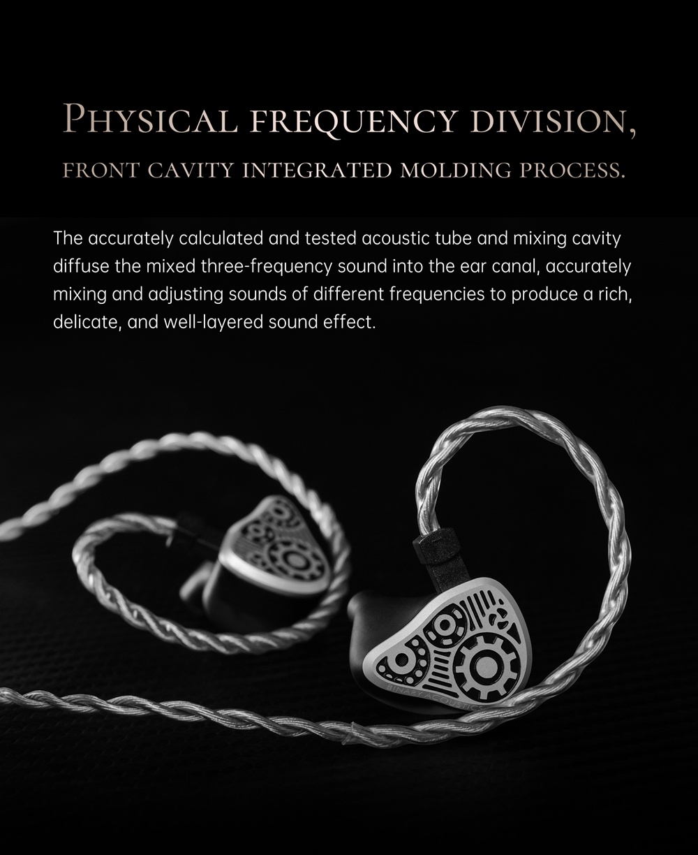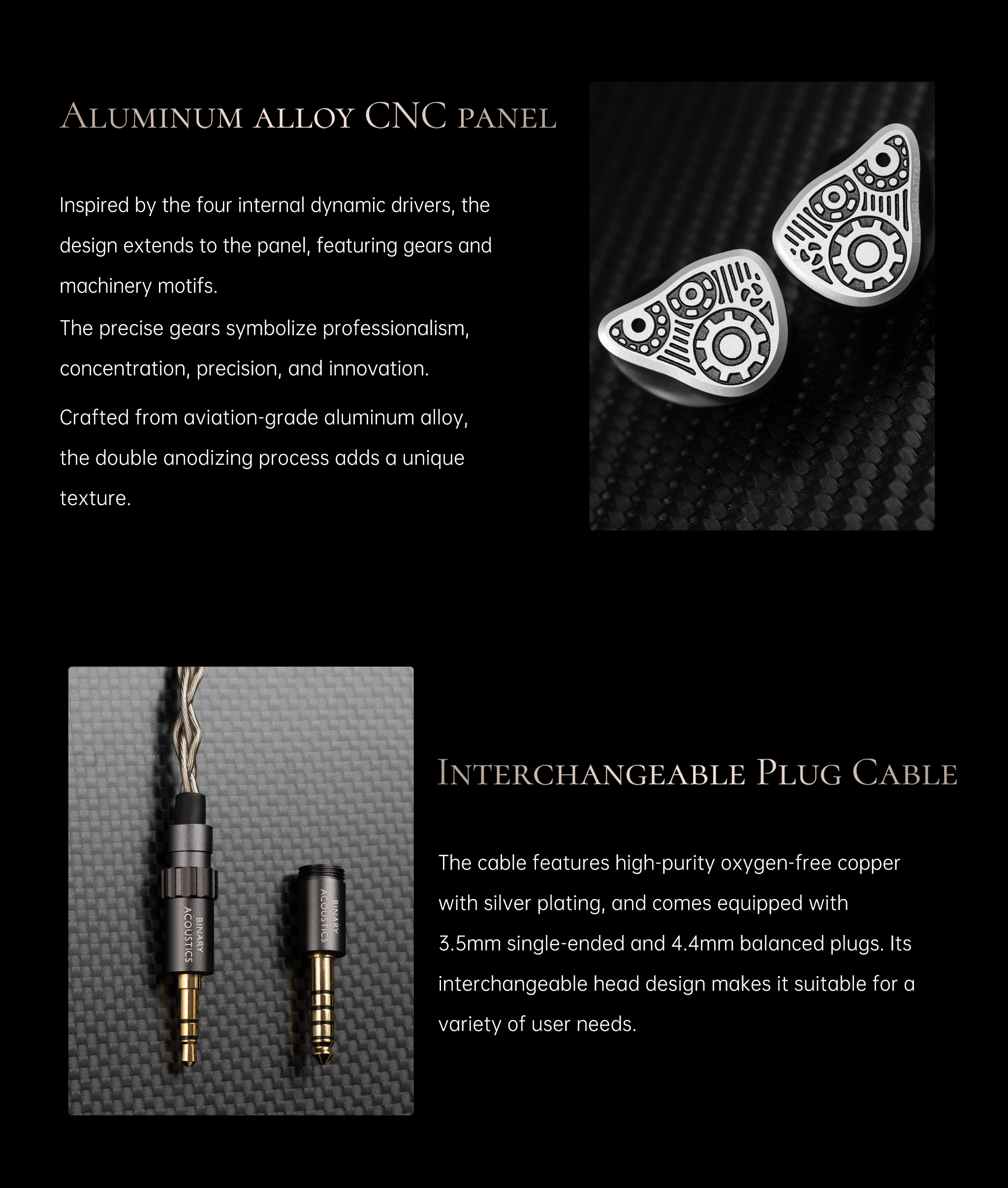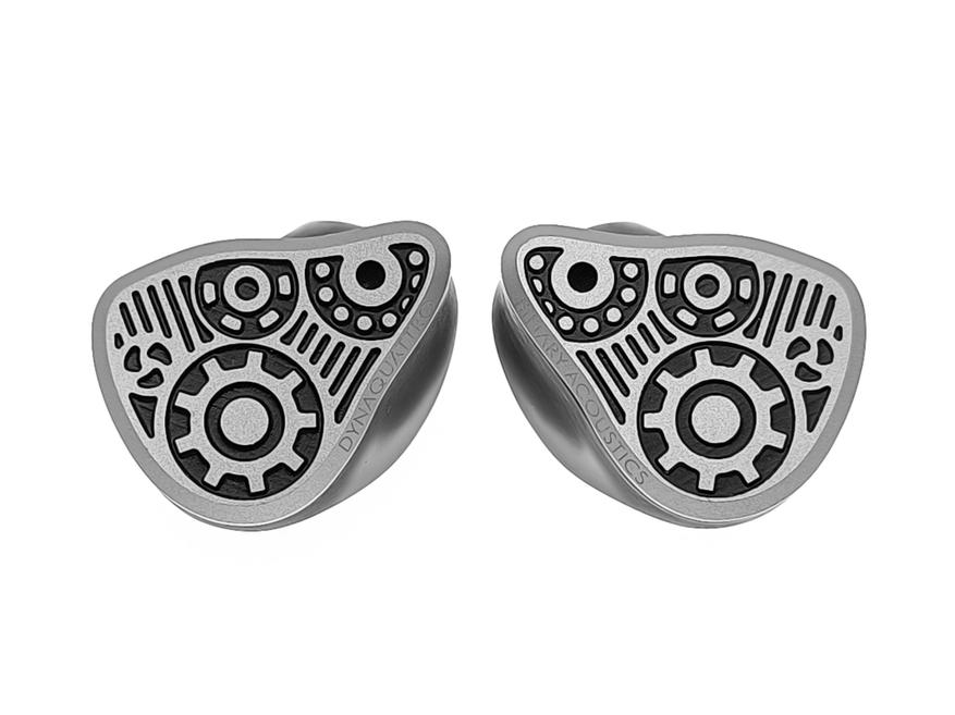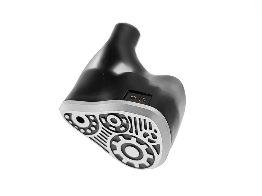 Лицевую сторону наушников украшает алюминиева панель с вырезанными на фрезеровочном станке декоративными шестернями. Основная же часть корпуса наушника изготовлена из напечатанного на 3D принтере тактильно приятного, но собирающего отпечатки, частично прозрачного черного пластика.