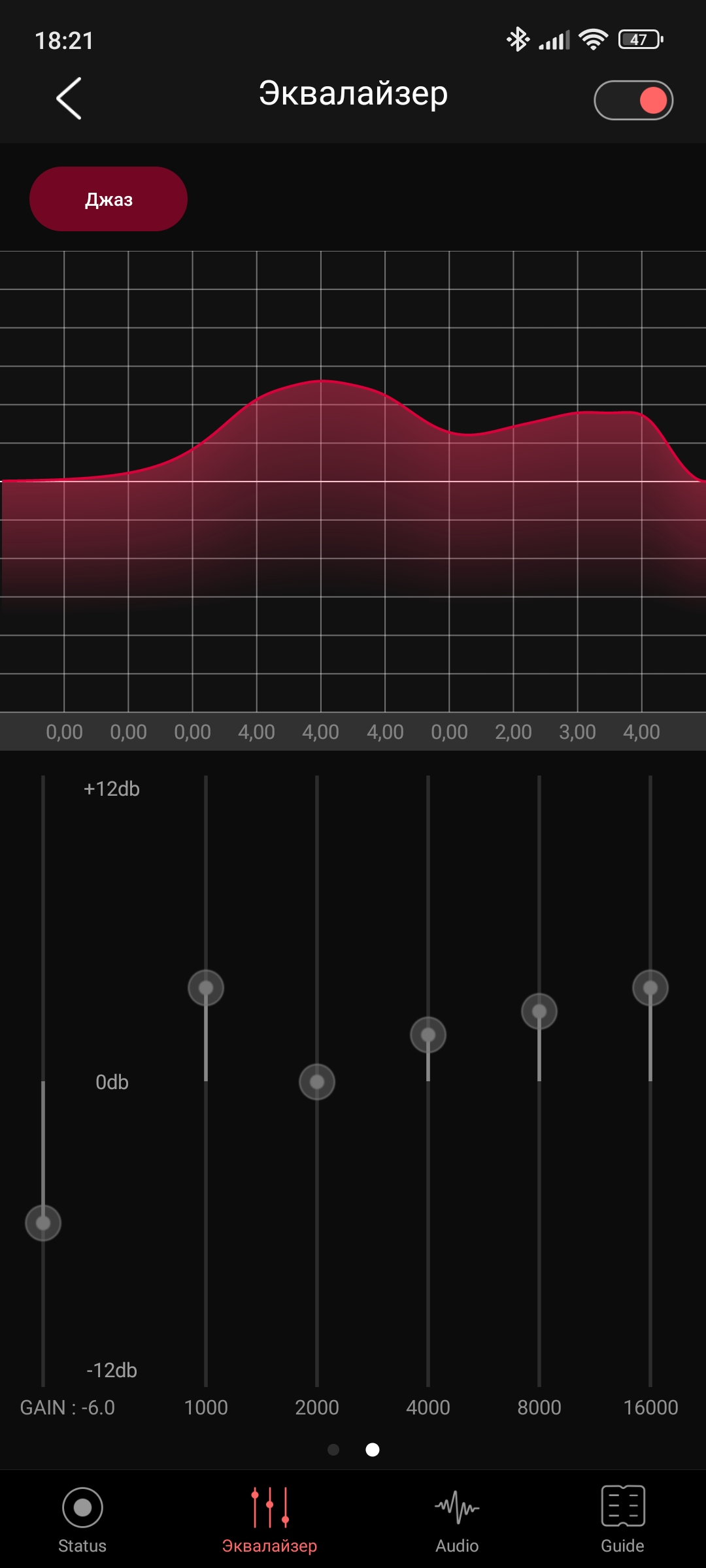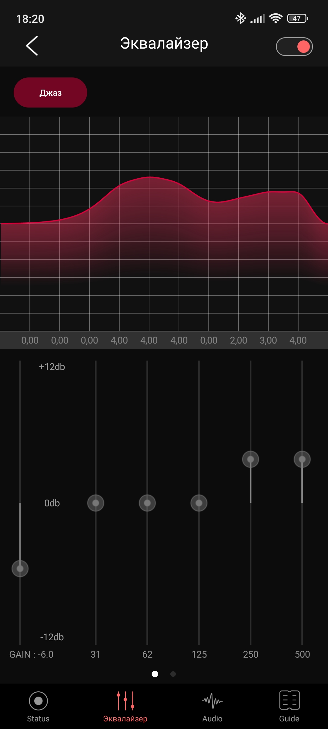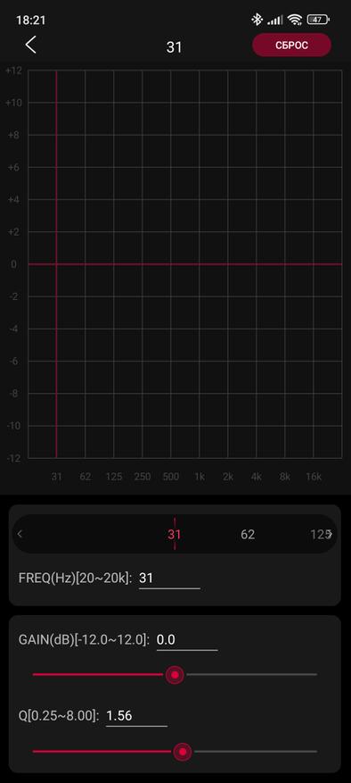 Вторая страница уже интереснее: тут расположена одна из основных фишек ресивера — эквалайзер. Доступен выбор из 7 предустановленных пресетов и есть возможность сделать два пользовательских. Причем кроме классического десяти-полосного эквалайзера доступен и параметрический: также по 10 разным точкам, которым по вашему желанию можно придавать любые значения.