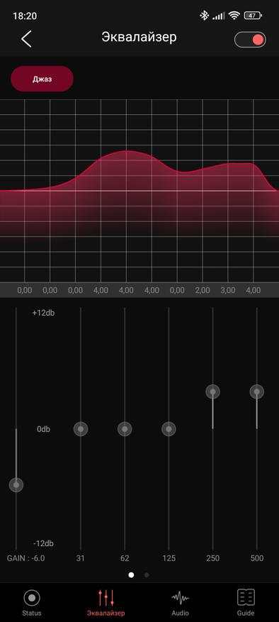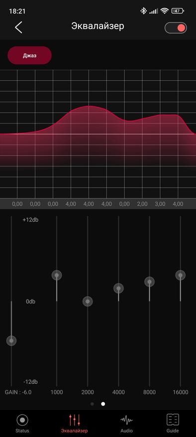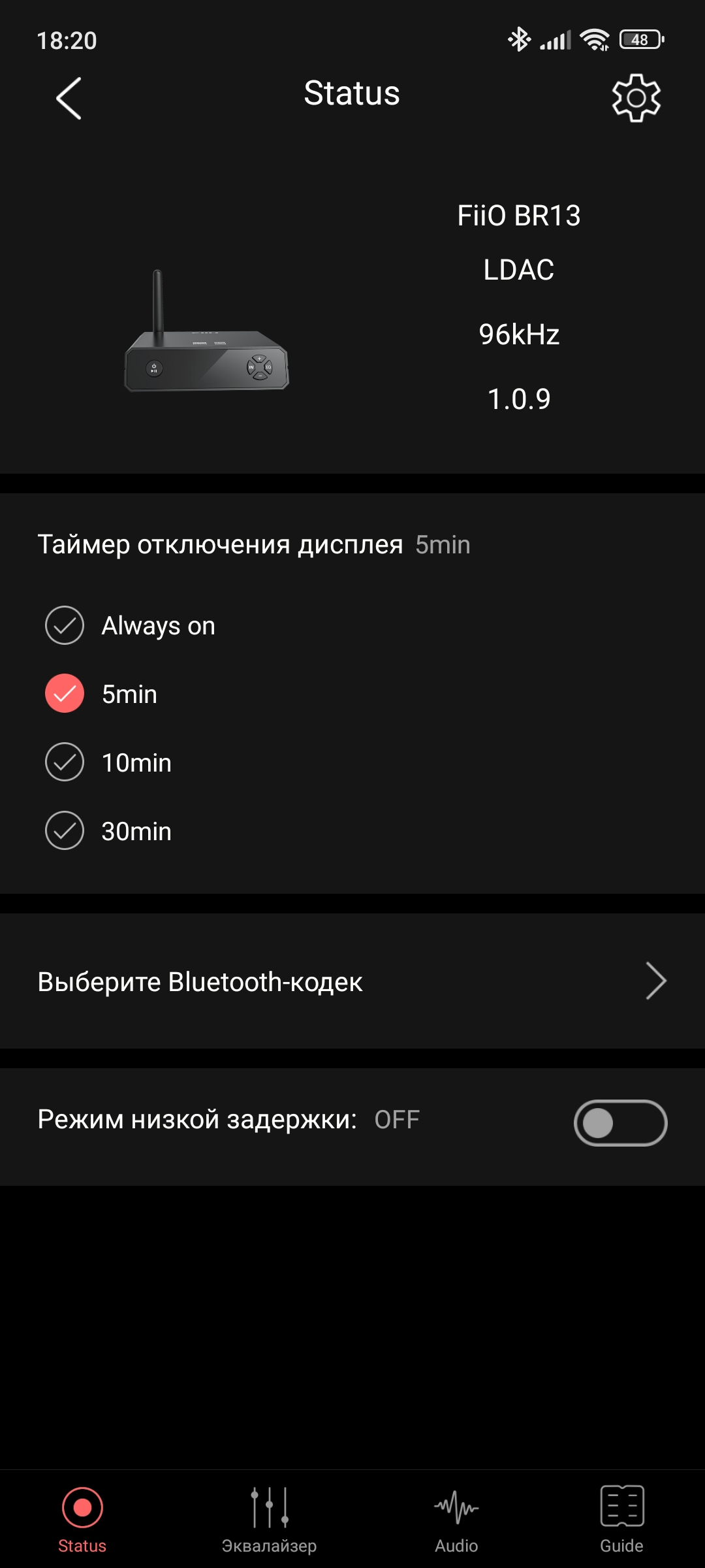 Первая страница отдана базовым настройкам: таймер отключения экрана (само устройство при этом не отключается), включение и выключение Bluetooth кодеков и включение режима низкой задержки.