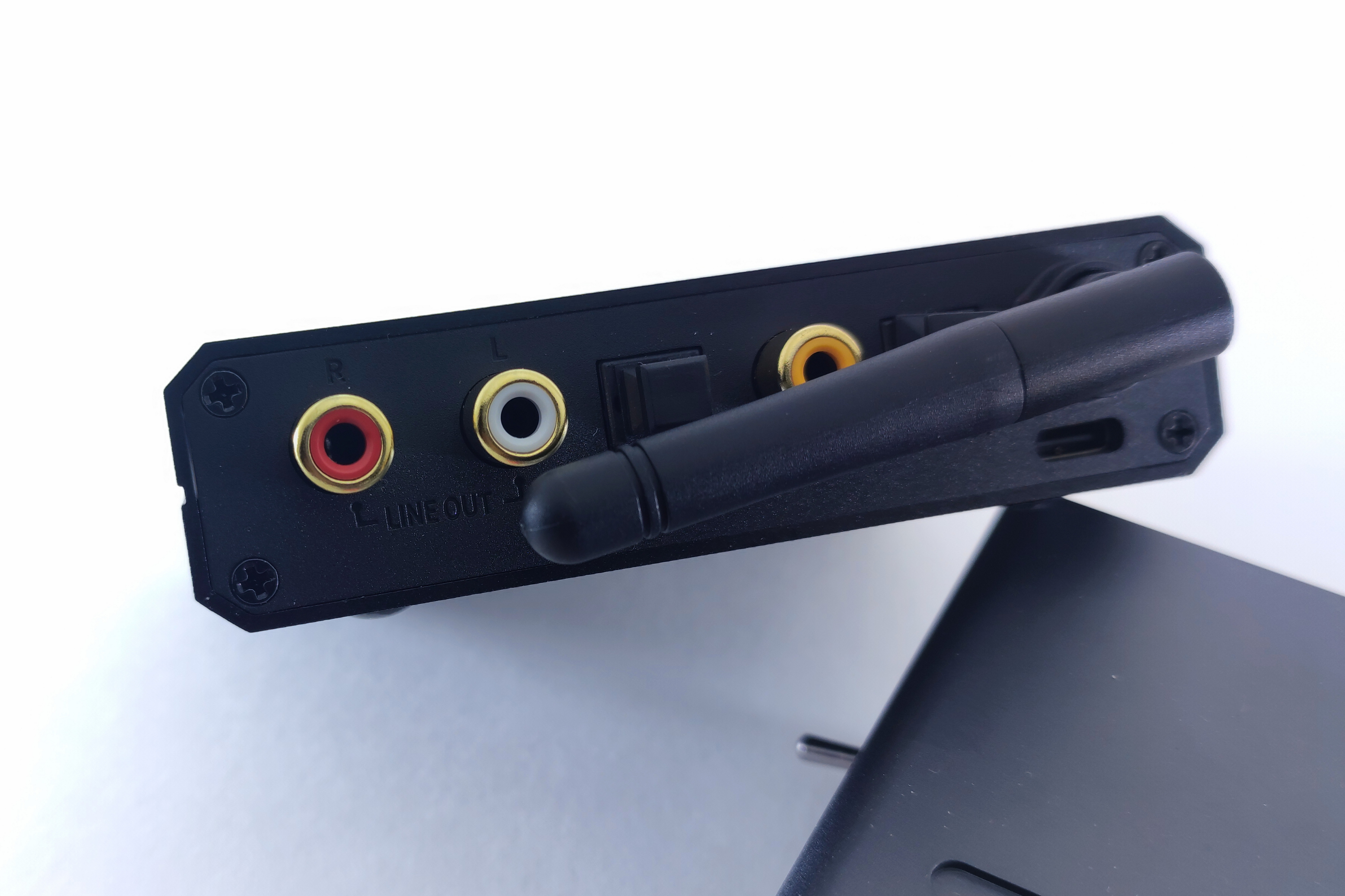 На задней панели сосредоточились все разъемы, причем максимально компактно: линейный RCA выход, оптический вход/выход и коаксиальный вход/выход, а сбоку — антенна.