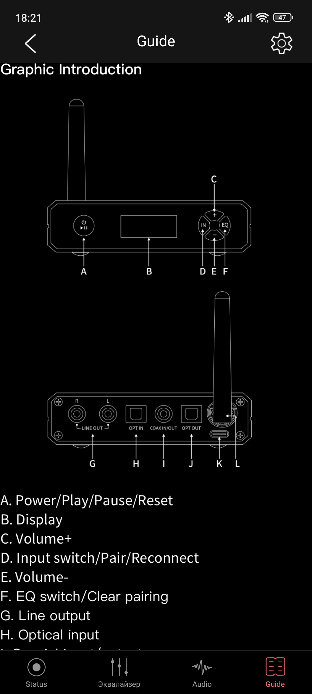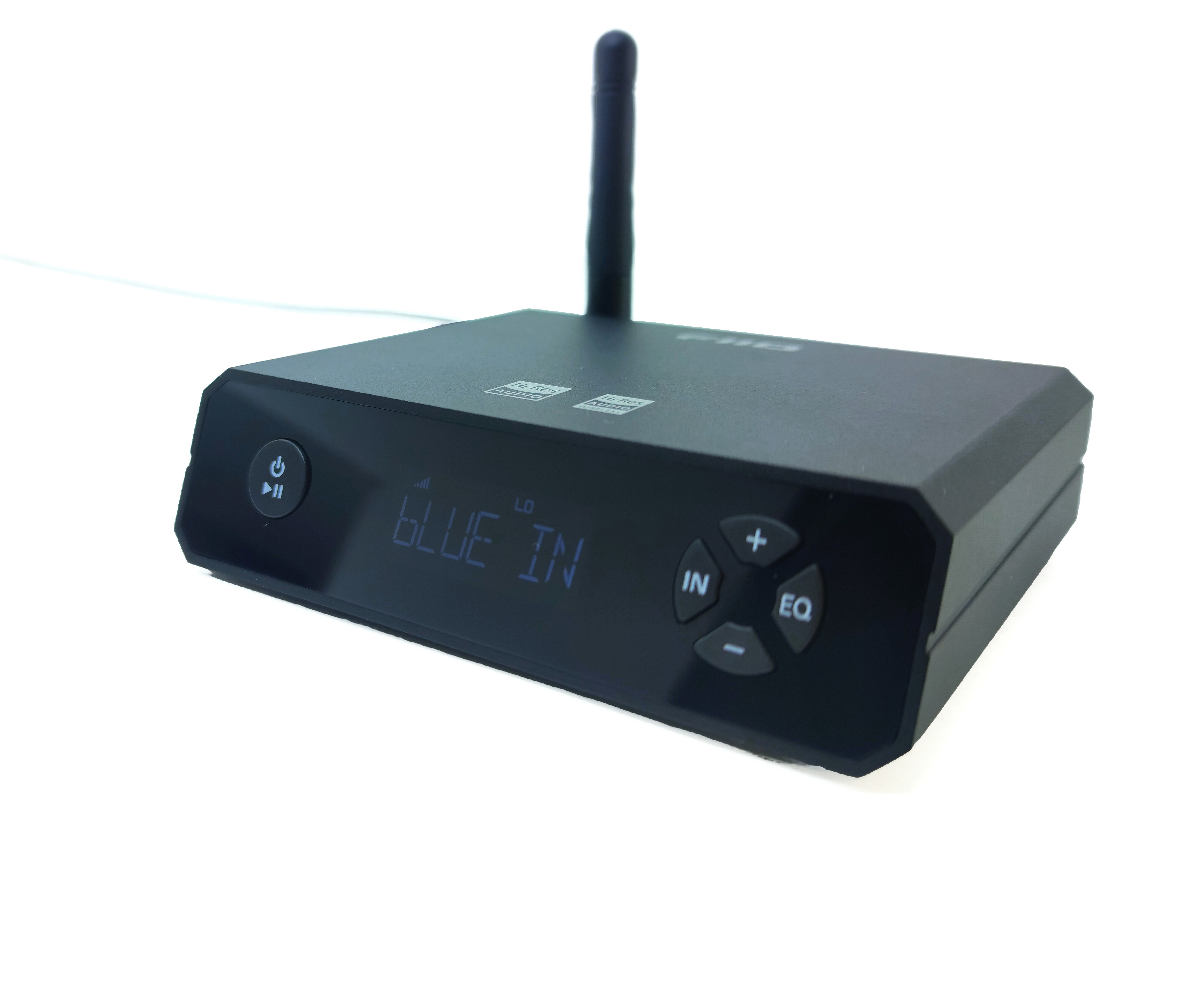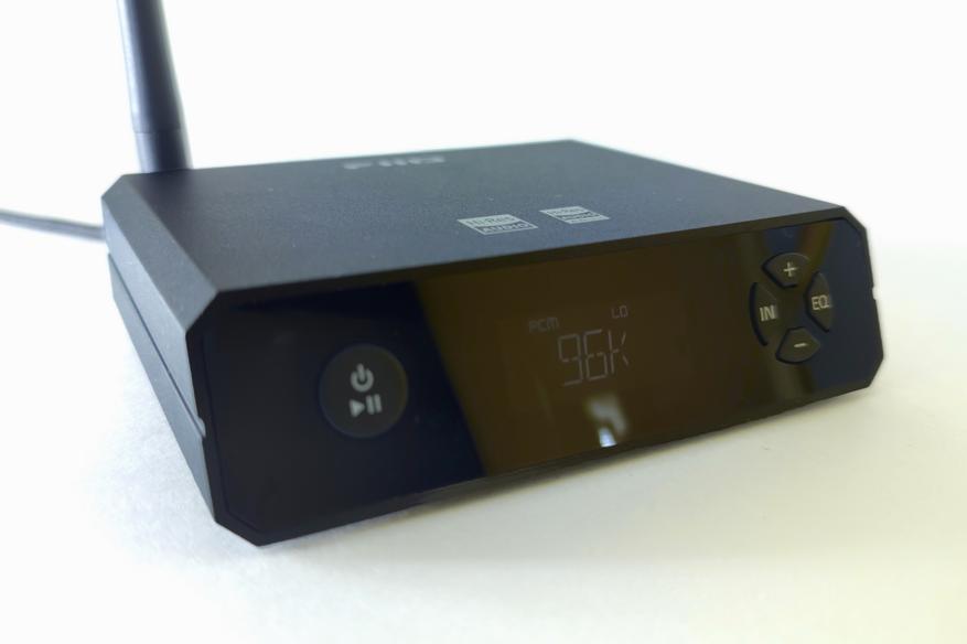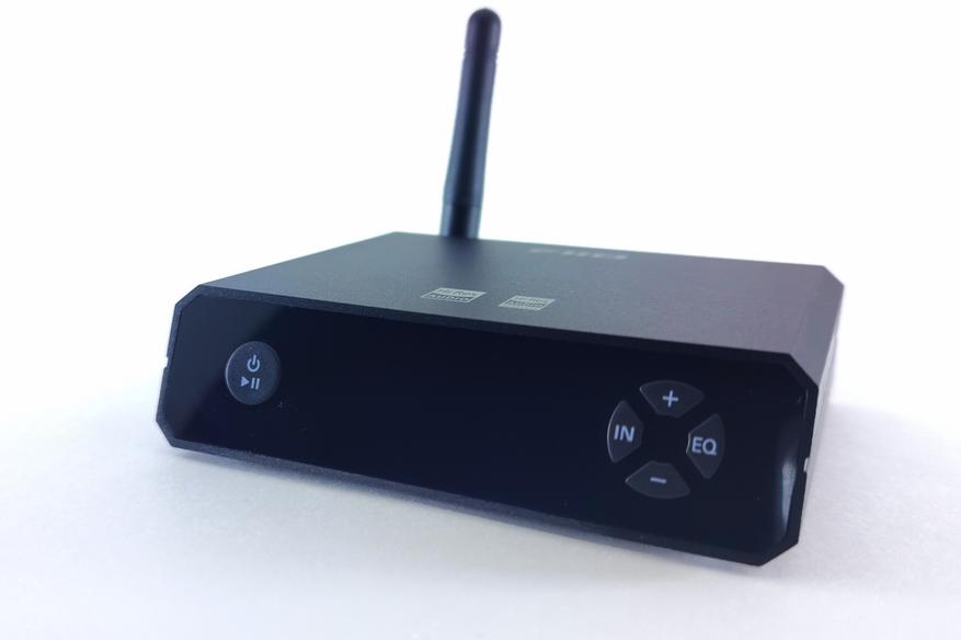 На передней части устройства расположены все элементы управления: слева — кнопка включения и управления воспроизведением, в центре — LCD экран, а справа — 4 кнопки для выбора входа, переключения пресетов эквалайзера и управления громкостью. К слову, последние два элемента дублируются в приложении, но об этом позже.