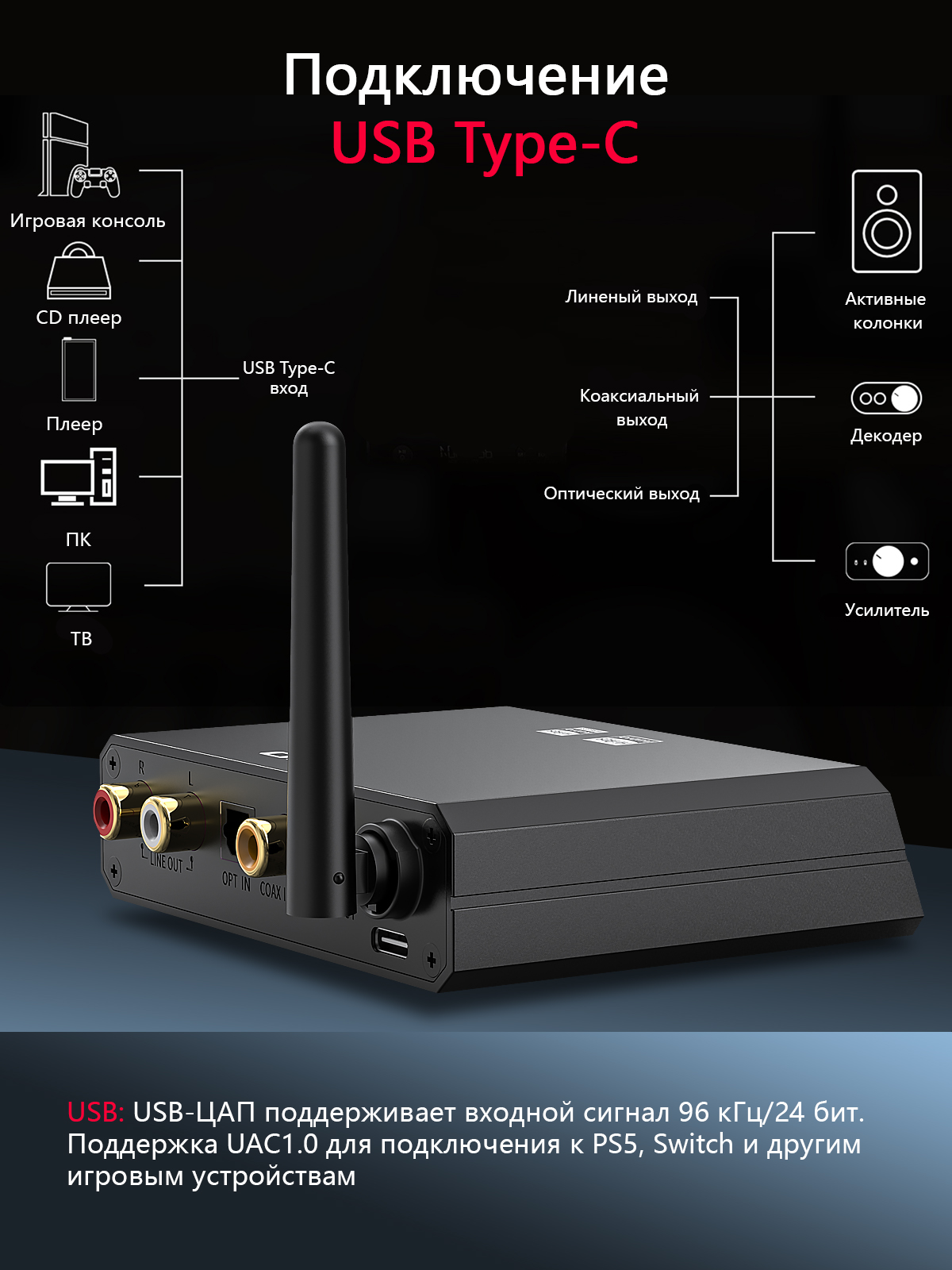 Данный сценарий уже откровенно посложнее: вступают в дело вопросы коммутации и отсутствия пульта дистанционного управления. Идеальный вариант будет Android приставка или телевизор, которые, аналогично ПК, смогут без заморочек вывести сигнал и питание по USB. Ну и не забываем про оптические входы — уж оптика всегда найдется. С заменой пульта всё несколько сложнее: да, есть мобильное приложение для регулировки громкости, но входы там переключать нельзя. Хотя если вы обычно используете только оптику или USB, лишь иногда переключаясь на Bluetooth — BR13 явно будет в пору.