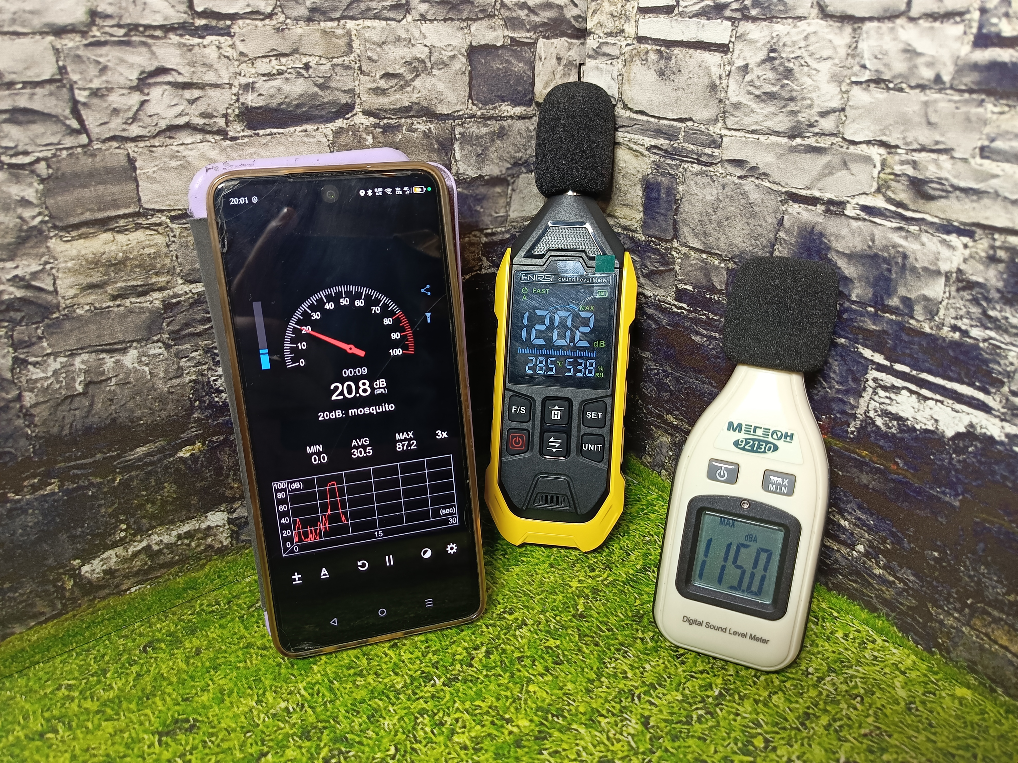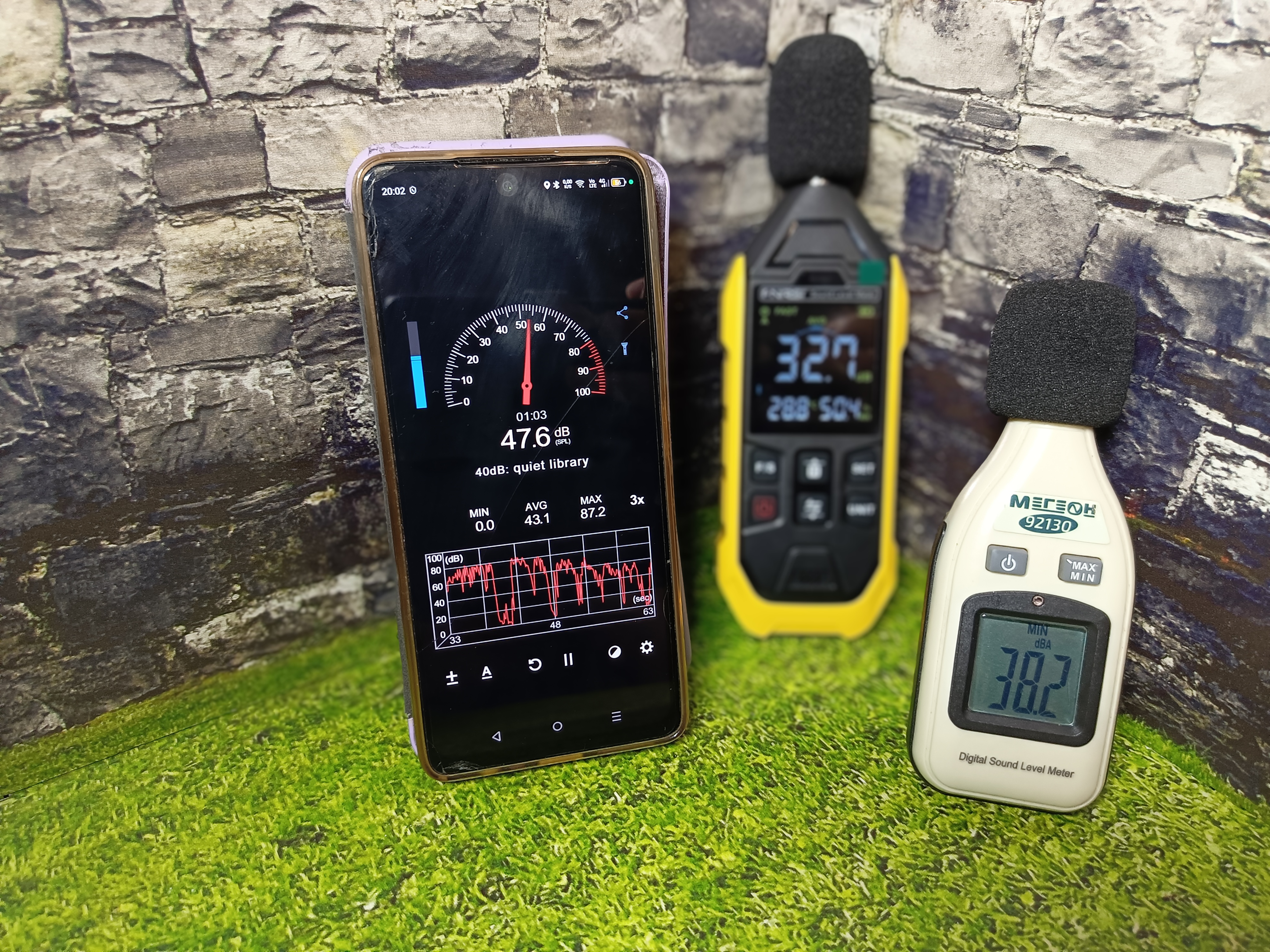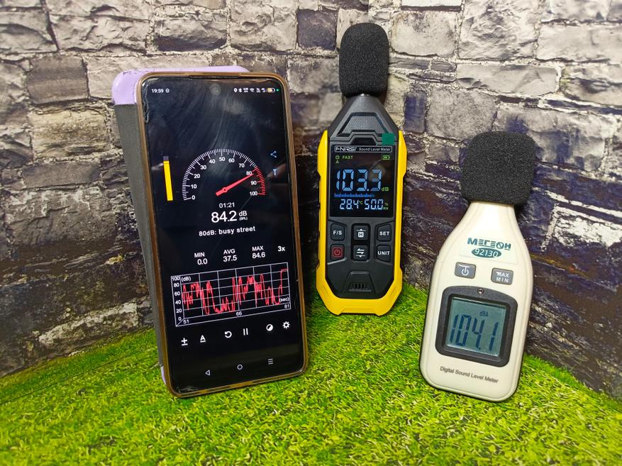Калибровочного стенда у меня нет или поверенного измерительного прибора, но я решил сравнить показания с другим шумомером, а также со смартфоном. Положив все приборы в одном месте и включив на колонках фоновый статический шум получил следующие результаты: