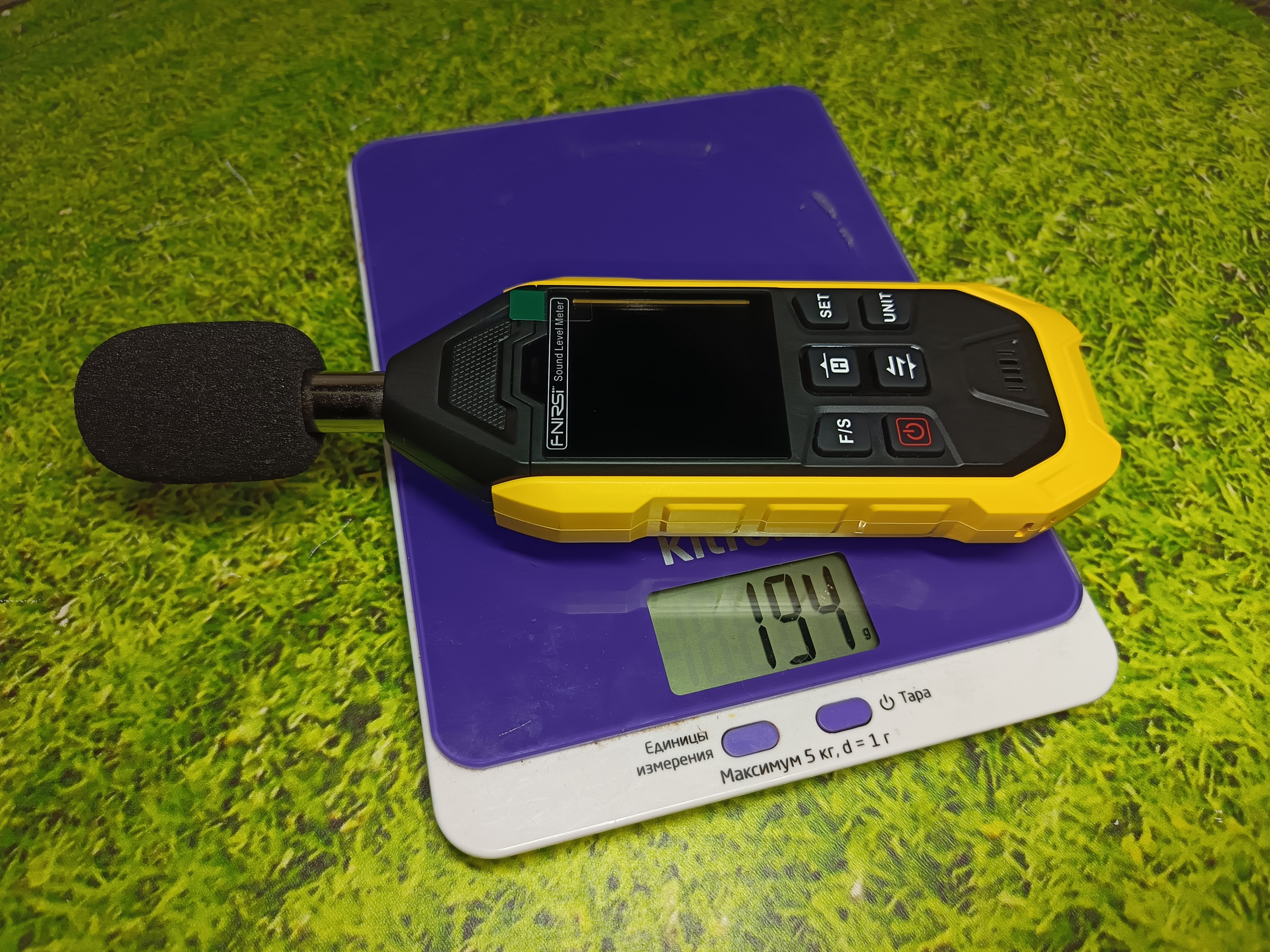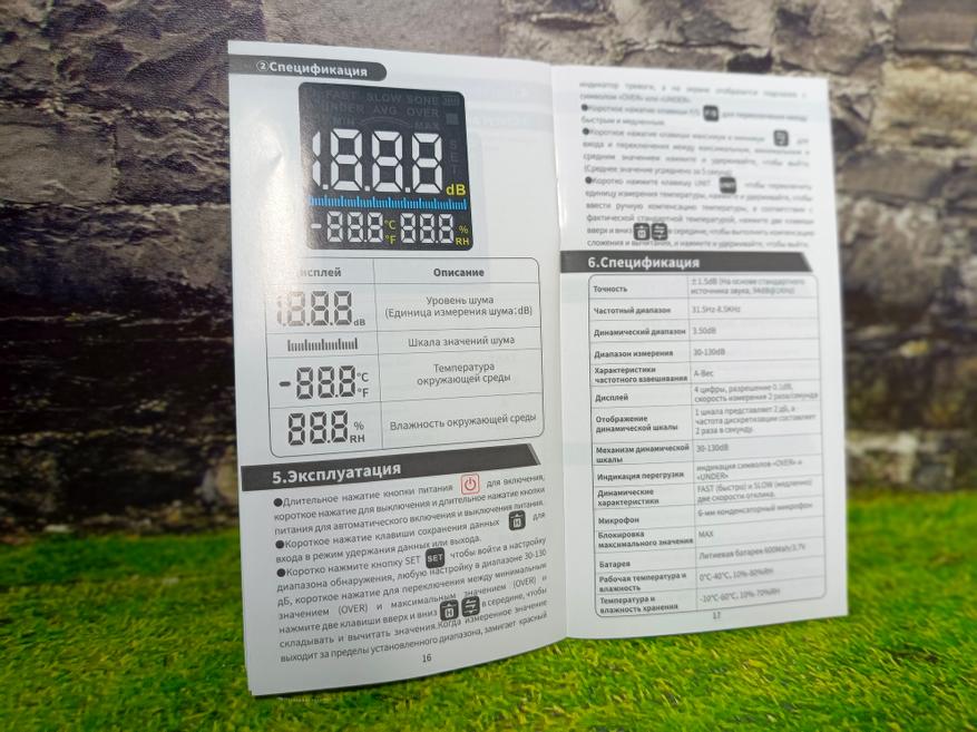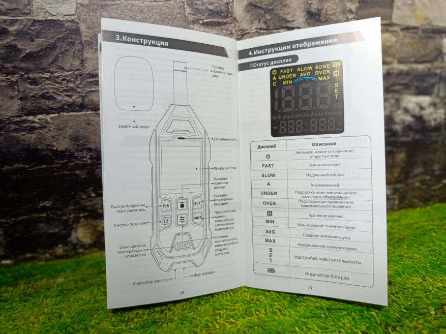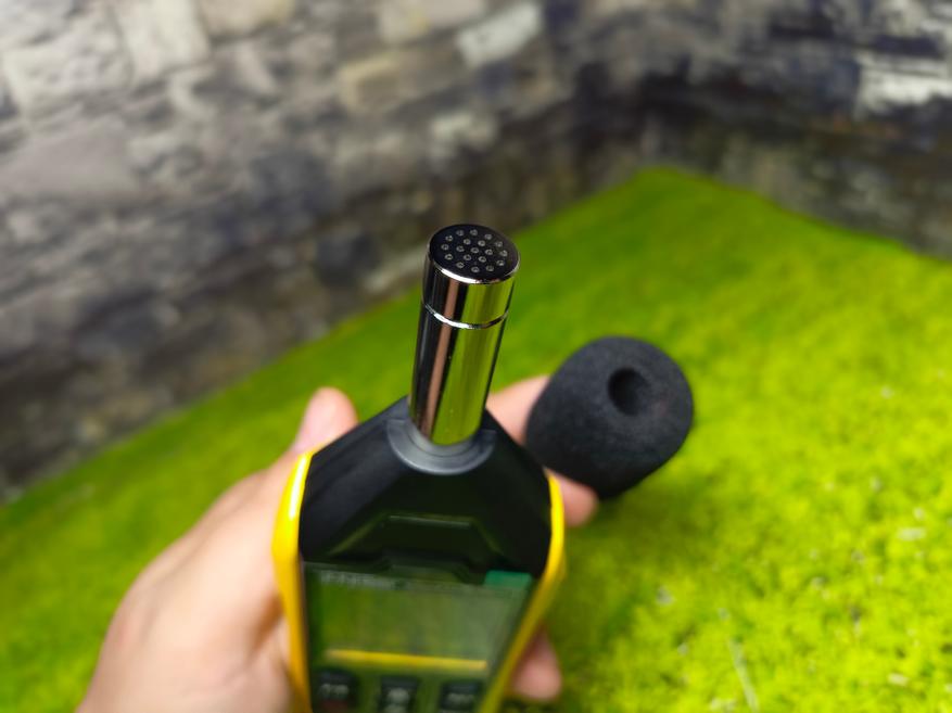 Сверху находится сам микрофон с съёмной ветрозащитой. В целом всё типично для шумомера.