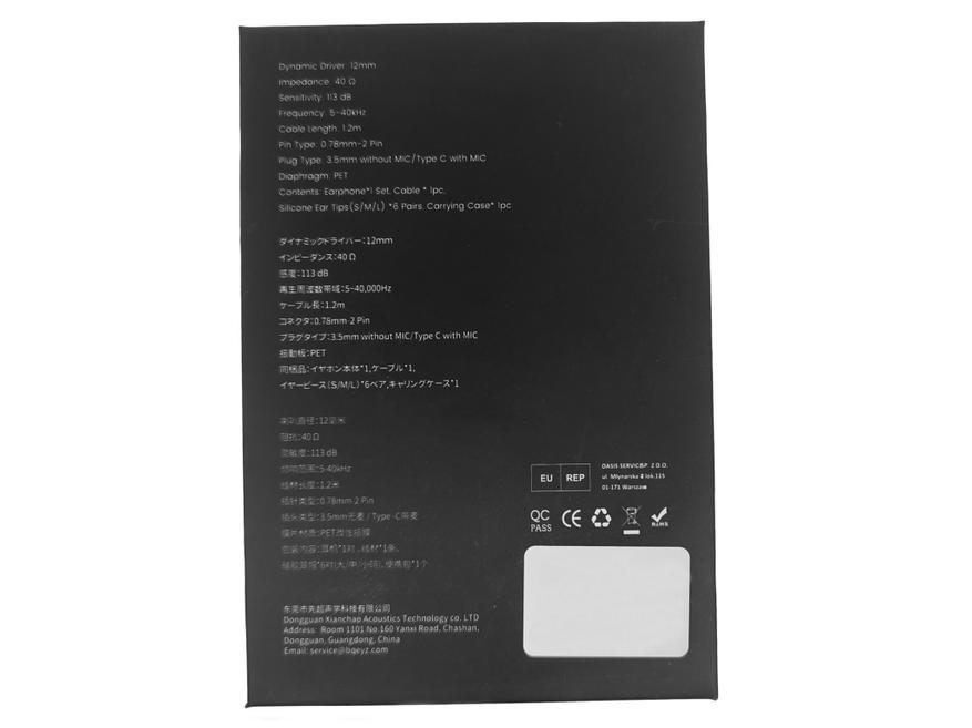 Наушники поставляются в маленькой чёрной коробке из плотного картона, на лицевой стороне которой находится название и изображение наушников, а с обратной стороны указаны их спецификации и контактные данные производителя. На торцах коробки сообщается о версии комплектного кабеля и главных особенностях наушников.