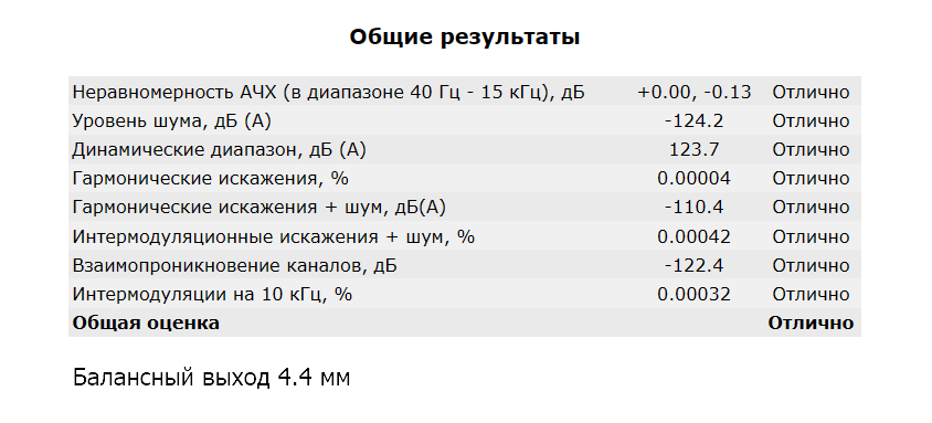 Что в процентах дает 0.00004 и 0.00006 соответственно. Интермодуляционные искажения соответствуют минус 134 дБ, причем как для несимметричного, так и для балансного выхода. То есть всё идеально.