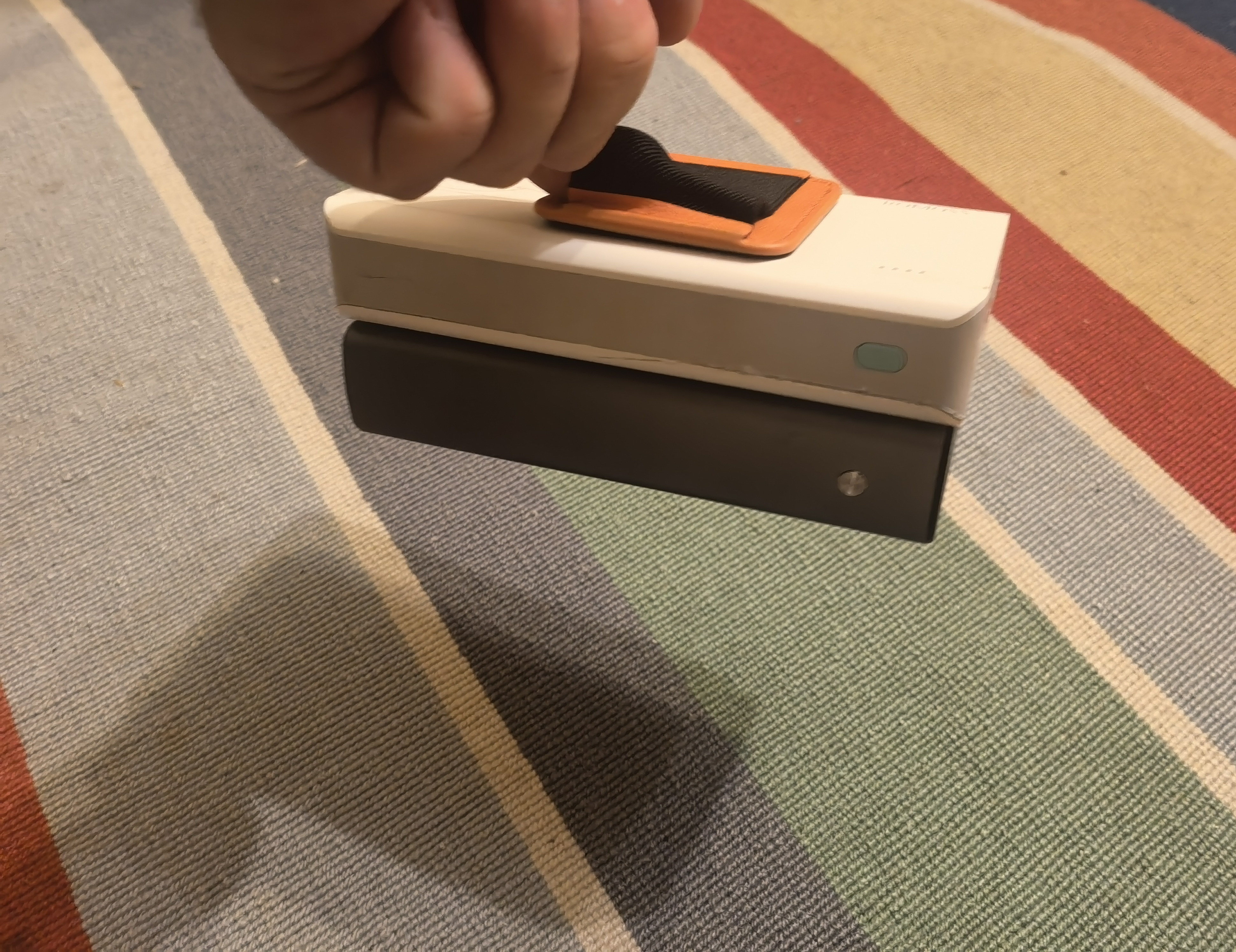 Проверил практически заявленный вес, который способен выдержать магнит, и, следовательно, силу, которой можно сдвинуть магнит с места. Я поднял им скреплённые два повербанка, Romoss 30000mAh Sense 8+ и USAMS 30000mAh US-CD165. Суммарно два аккумулятора весят 1,335 кг. Можно сказать, что чехол Shanling вес «взял». Продержался он так до небольшого рывка, поэтому можно считать 1,3 кг как требуемый вес, который надо приложить, чтобы сдвинуть магнит с места (13Н, если говорить о силе в Ньютонах). Скотч при этом не шевельнулся.