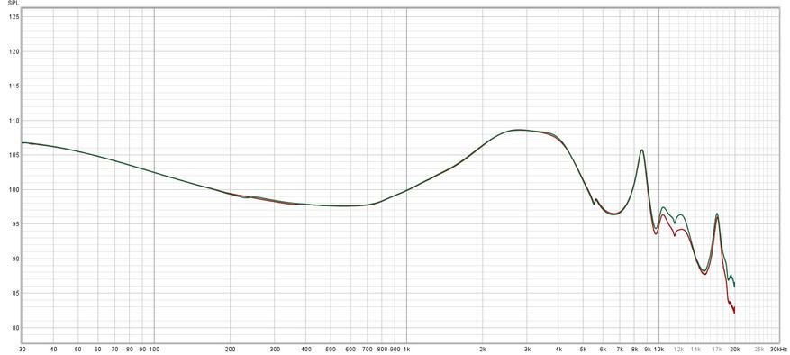 Измерил АЧХ с каждым комплектом насадок. Как я уже отметил, прозрачные амбушюры немного приподнимают область высоких частот (зеленая кривая):