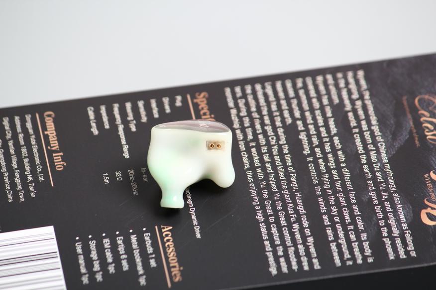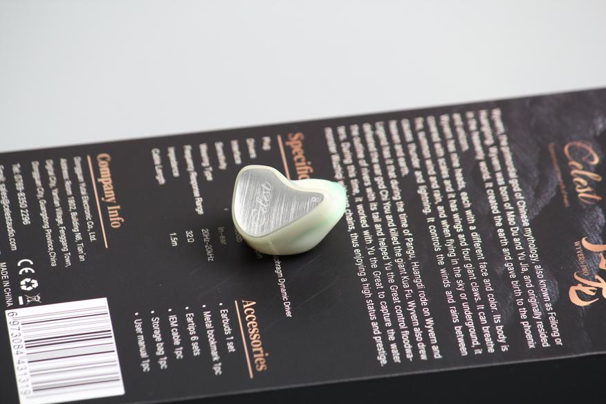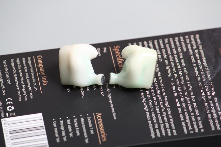 Корпуса сделаны из эпоксидной смолы. Лицевая панель крепится при помощи клея. Она заметно выделяется на фоне всей остальной части корпуса. На ней можем видеть «расцарапанную» вставку серого цвета с нанесением «Celest». Внутреняя часть вроде как белого цвета, но сквозь неё проглядывается начинка. Получается забавный рисунок, с вкраплением зеленого, будто так было задумано изначально. К минусам отнесу не совсем ровно приклеенную металлическую пластину, призванную изолировать звуковод. Провод подключается к плоской площадке за счёт соединения 2pin. Звуководы средней длины, c бортиками.
