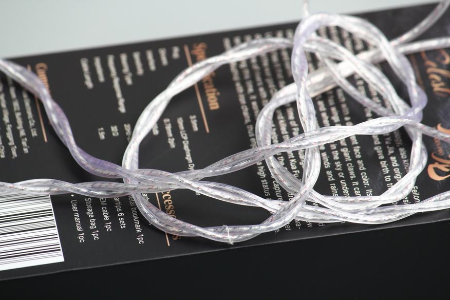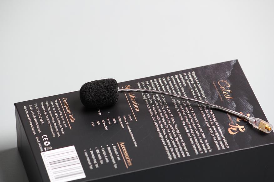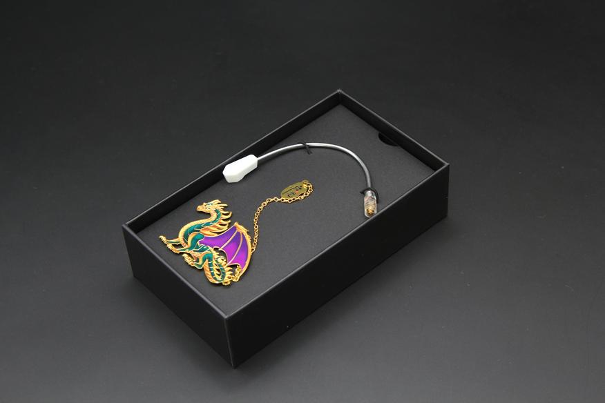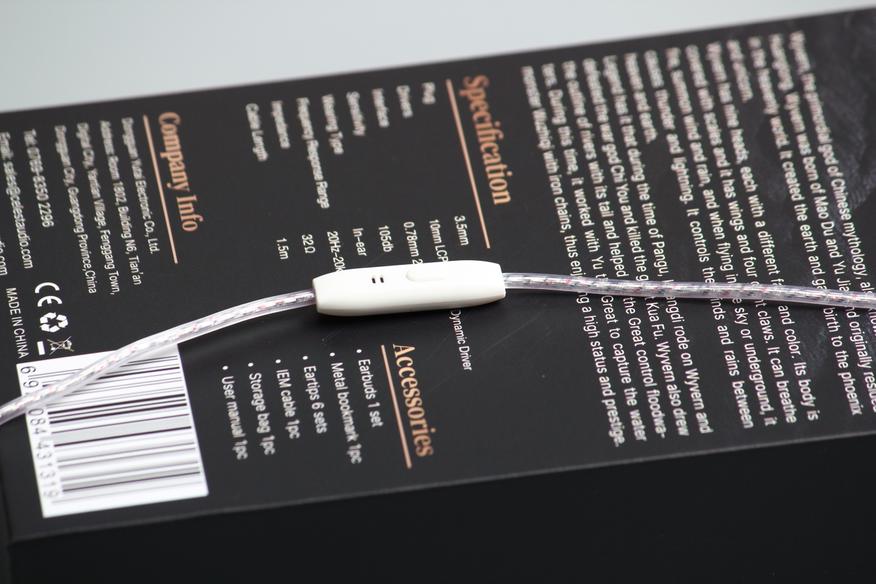 Под верхней крышкой у нас два отдела. Вверху я обнаружил выносной микрофон, закрепленный двумя стяжками. Чуть ниже расположился металлический брелок мифического существа. «Виверна или виверн (англ. Wyvern) — мифическое существо, разновидность дракона с одной парой лап. Часто изображаются со змеиным хвостом, иногда имеющим ядовитое жало». На дне коробки были найдены сами наушники с подключенным проводом, а также два комплекта насадок.