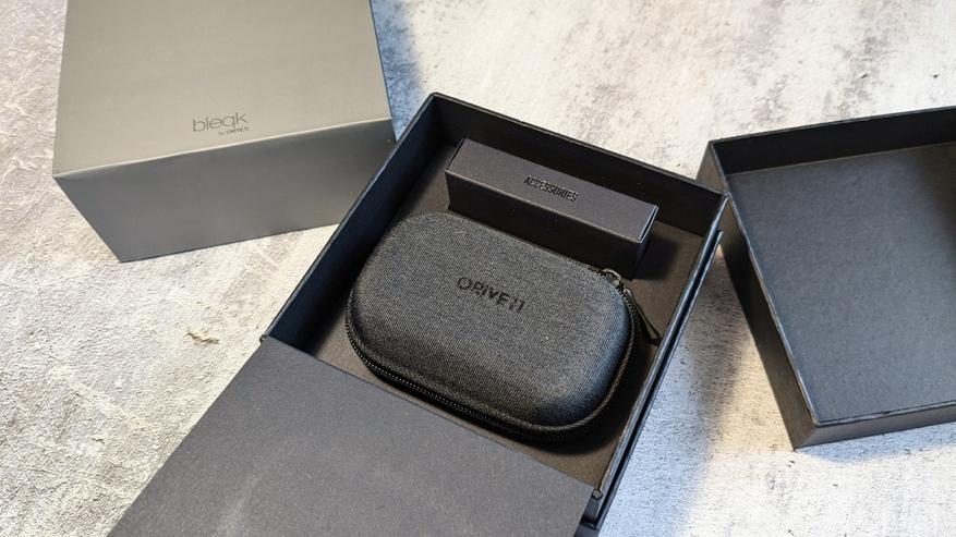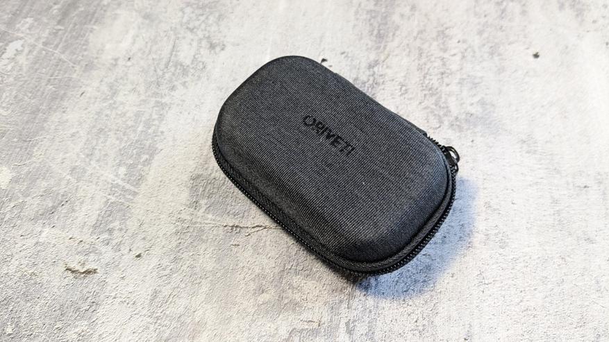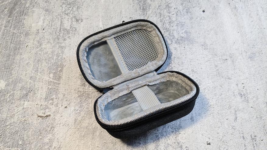 Комплект поставки достаточно скромный. Присутствует брендированный овальный кейс на молнии. Внутри кейса можно разместить как наушники, так и насадки — для них предусмотрен небольшой сетчатый карман. Есть горизонтальная резинка, позволяющая хорошенько зафиксировать содержимое.