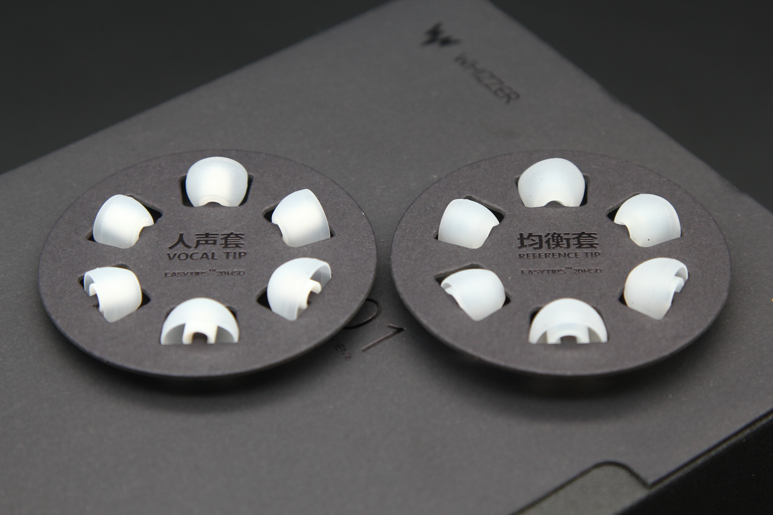 Силиконовые насадки зафиксированы на круглом держателе из картона. В каждом наборе по 6 насадок (S/M/L). Вокальные амбушюры отличаются диаметром отверстия и цветом стержня. Так же немного отличаются стенки, а точнее их плотность. Мне подошли именно вокальные амбушюры, они обеспечивают лучшую звукоизоляцию, за счёт более плотных стенок.