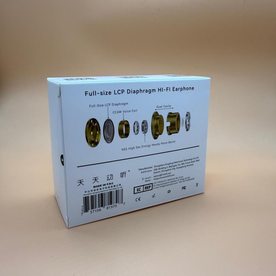 TinHifi C3 MkII поставляется в небольшой белой коробке с минималистичным дизайном. На передней части коробки указана модель IEMов с небольшим логотипом TinHifi сверху, а на задней части нарисовано строение динамического драйвера и информация о производителе. Удивительно, но TinHifi не предоставило информацию о спецификации IEMов. Возможно у меня предрелизный экземпляр и они сделают это в будущем.