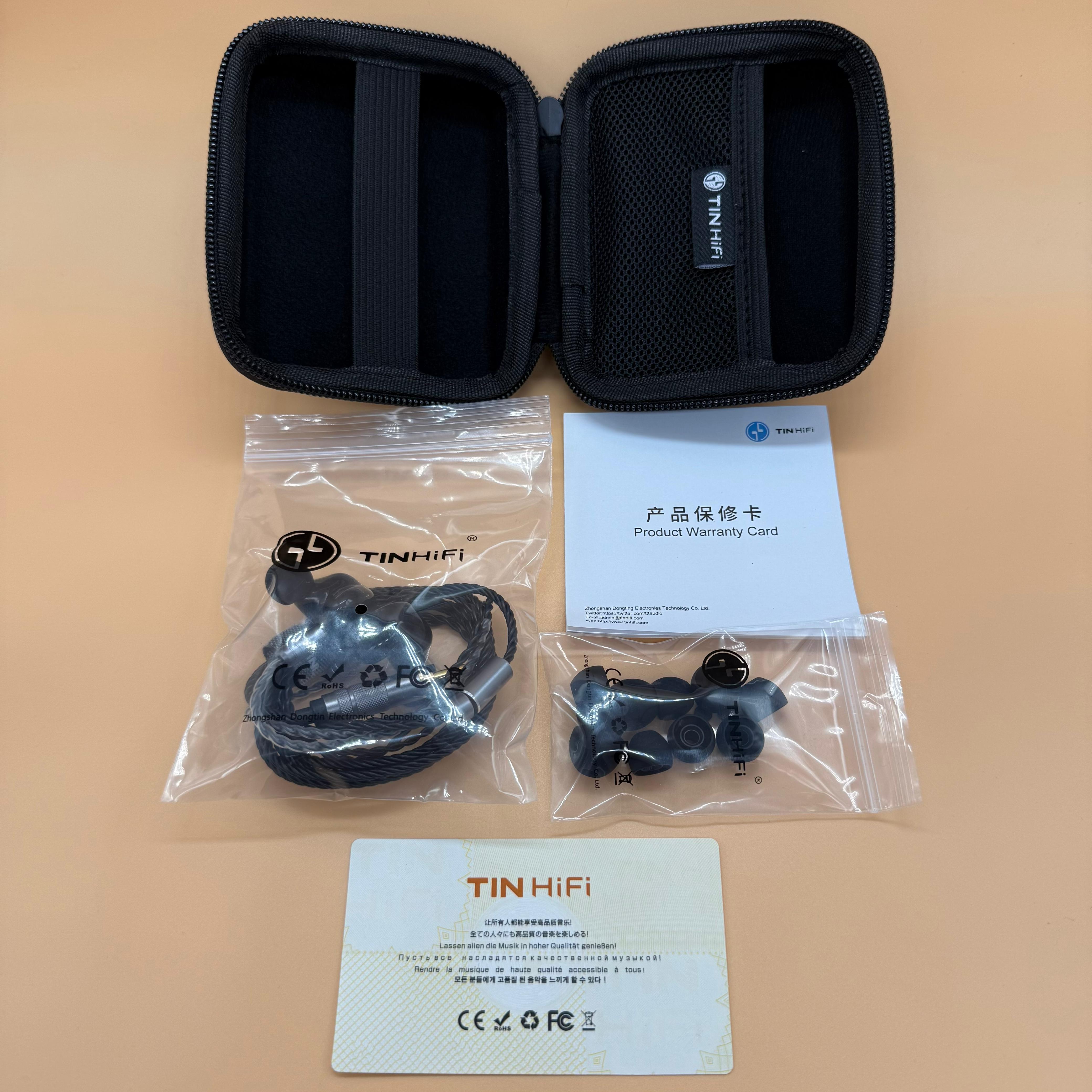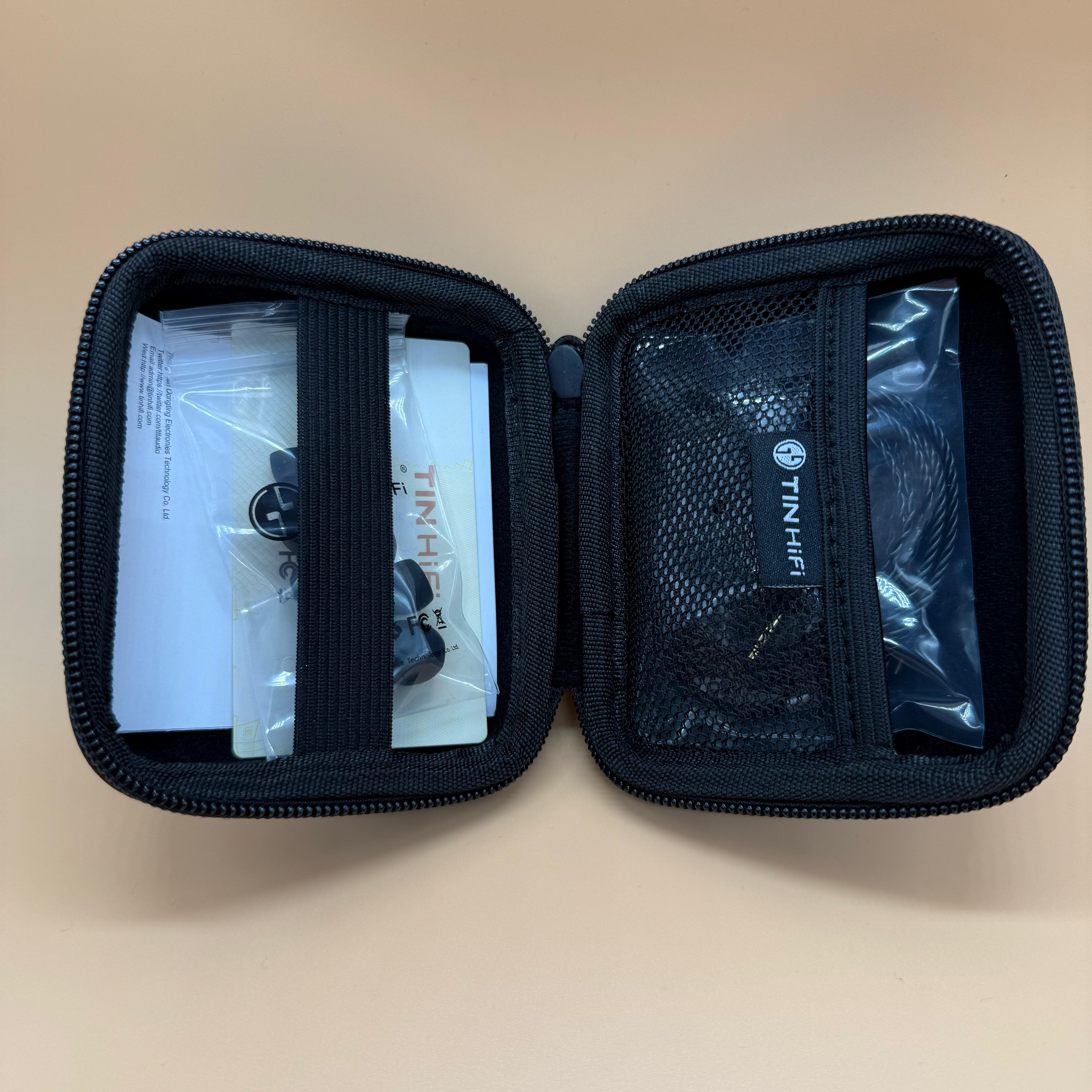Внутри коробки находится большой футляр для переноски, размером с саму коробку. Открыв его, внутри находились несколько маркированных пакетов: один с самими IEMами и проводом, а другой с амбюшурами. Так же, внутри футряра лежал гарантийный талон и фирменная карточка TinHifi.