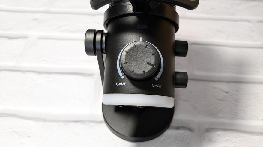 Спереди расположен крупный пластиковый регулятор, позволяющий настроить нужный баланс между игрой и голосовым чатом. Он позволяет увеличить громкость игры и приглушить собеседников, а так же приглушить звуки игры и уже увеличить громкость в чате. На мониторинг собственного голоса данная крутилка никак не влияет. Справа у нас ещё два регулятора — чувствительности самого микрофона и наушникового выхода.