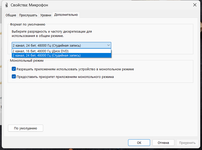 При подключении к компьютеру с операционной системой Windows 11 драйвера не потребовались. Что самое забавное — Fifine AM6 способен имитировать звуковую карту, ведь чисто теоретически к наушниковому выходу можно подключать не только наушники, но и простенькую акустику. В настройках записи у нас два доступных режима: 16 бит 48000 гц и 24 бит 48000 гц.