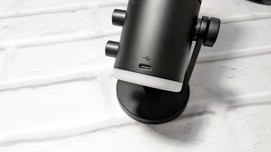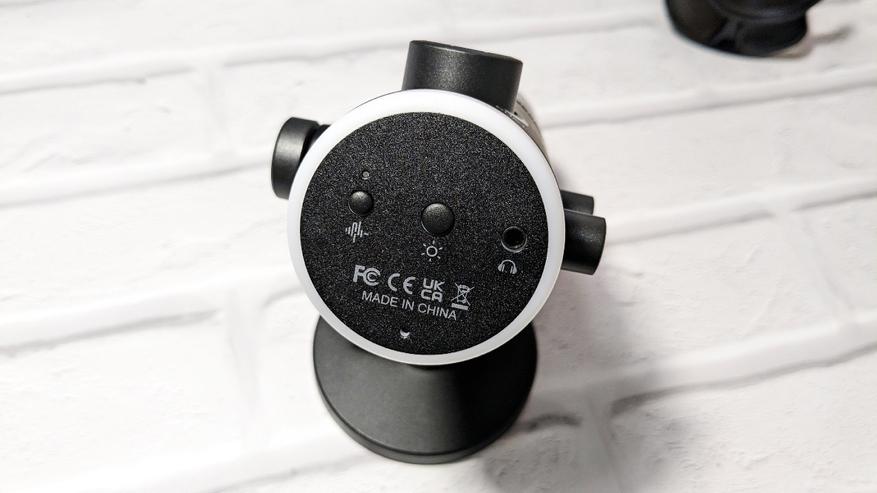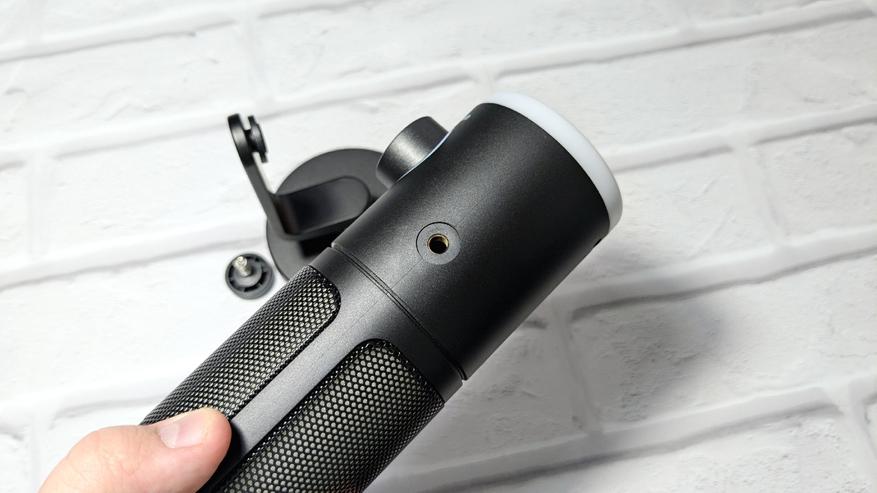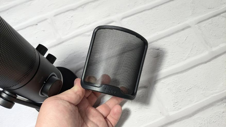 Вверху сенсорная площадка, позволяющая моментально приглушить все звуки и приостановить вещание. Для отключения или включения микрофона достаточно одного касания. Поп-фильтр с металлической решеткой и сомнительным пластиковым креплением, позволяющим сдвинуть фильтр в сторону.